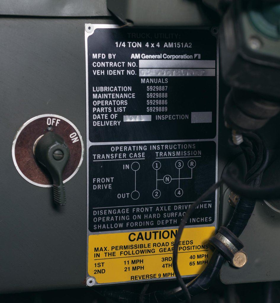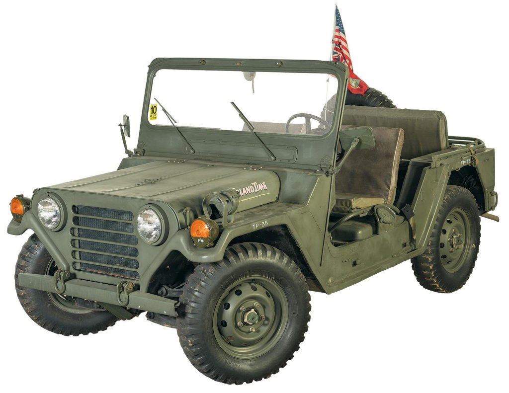 Designed by Ford and manufactured by Kaiser and AM General Corp. from 1959 to 1982, this is an example of one of the longest serving U.S. military vehicles and one rarely seen on domestic roads. Fitted with a 2.3L inline 4 cylinder motor, full independent coil spring suspension, and a 4 speed manual transmission with reverse. The inspection and delivery placard on the dash lists the model, specifications and the year of delivery as "1971". The hood has been decorated with "ISLAND TIME" on both sides in paint, and the windshield has a British Virgin Islands registration sticker. Seats 4 and includes a spare tire. Most M151s were either sold as surplus to foreign governments or simply destroyed by the government. Condition is very good in appearance, mechanically untested.