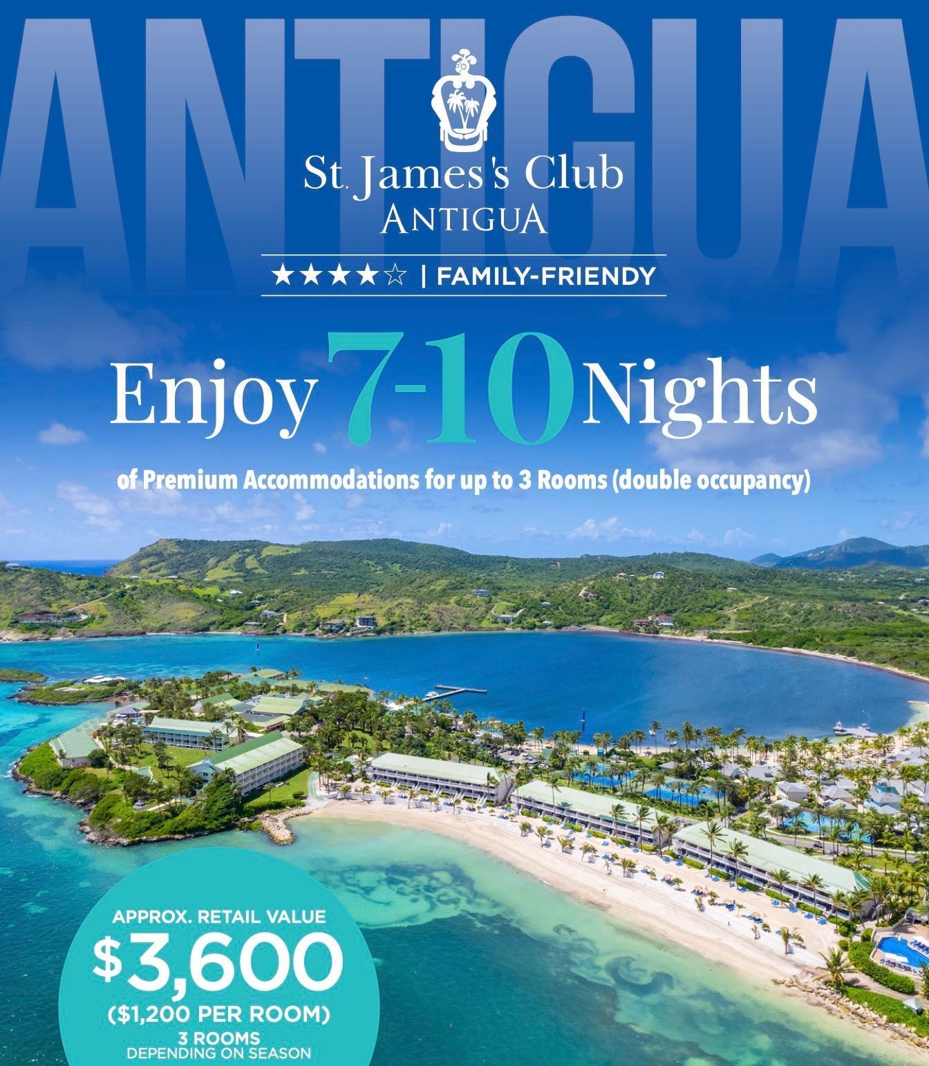 This donation provides Premium accommodations for up to 3 rooms (double occupancy) for up to 10 nights per room. (valued up to $1,200 per room depending on dates of travel) at St. James’s Club & Villas.