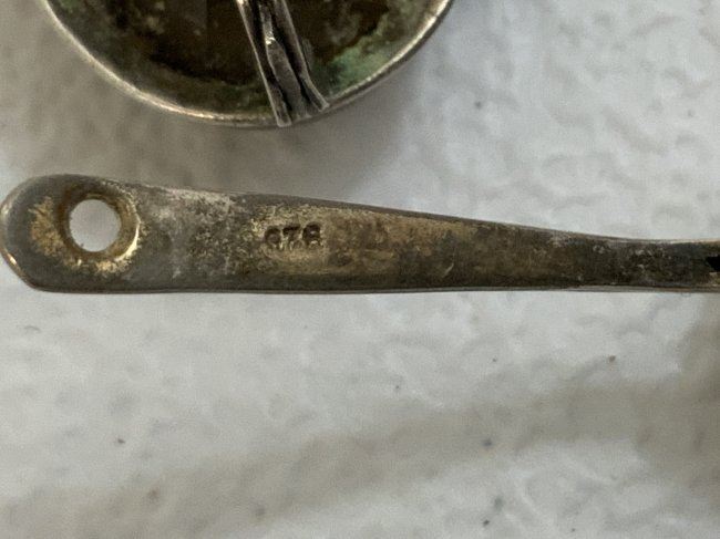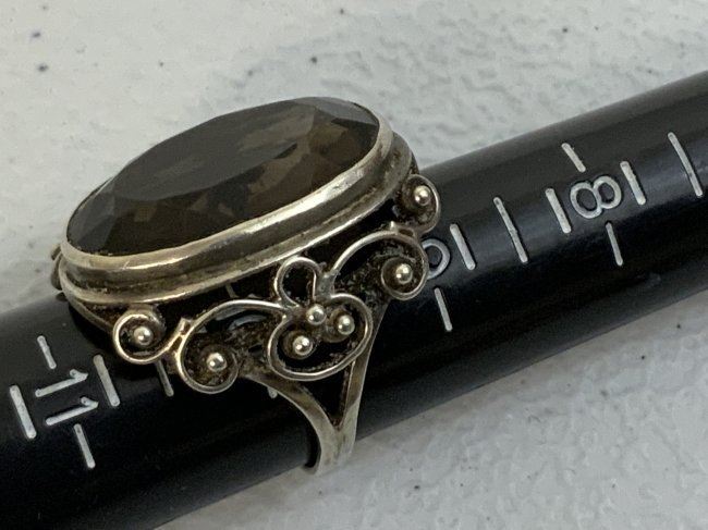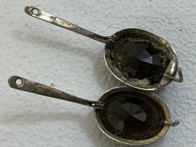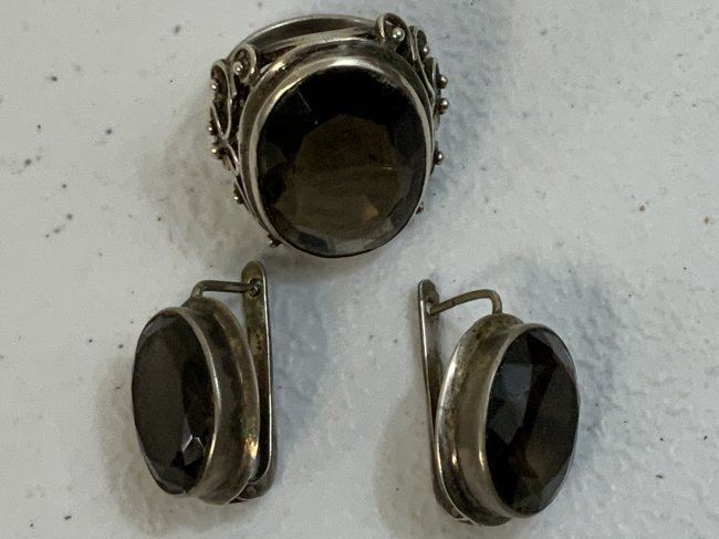 ANTIQUE 925 SILVER RING AND EARRING SET GYPSY STYLE EASTERN EUROPE . LARGE SIZE RING 10 . LARGE BROWN-GRAY COLOR STONE. MATCHING EARRINGS WITH EUROPEAN STYLE LOCKS AND STAMPED 925 .