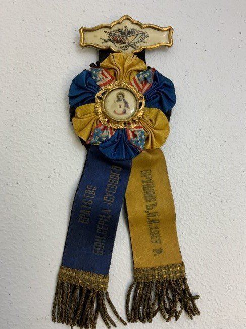 ANTIQUE AMERICAN - UKRAINIAN RELIGIOUS FRATERNAL SOCIETY BADGE WITH RIBBONS . RARE LARGE 2 SIDED BADGE. DATES BACK TO 1917 AND LOCATION IS BROOKLYN , NY . BLUE AND YELLOW UKRAINIAN COLORS INTERWOVEN WITH AMERICAN FLAG ON ONE SIDE AND BLACK FUNERAL USE MORNING BACK SIDE. VERY RARE FIND .