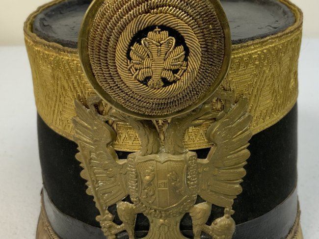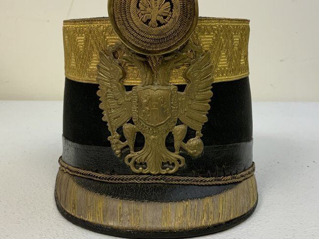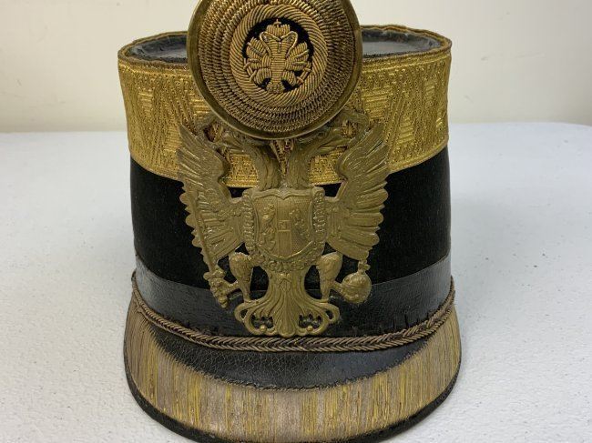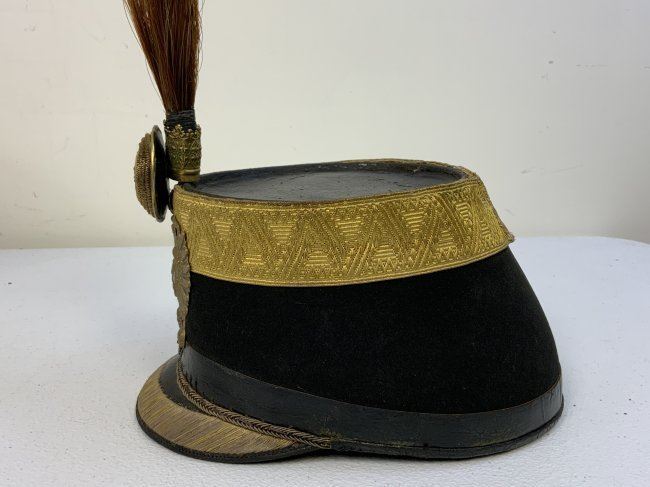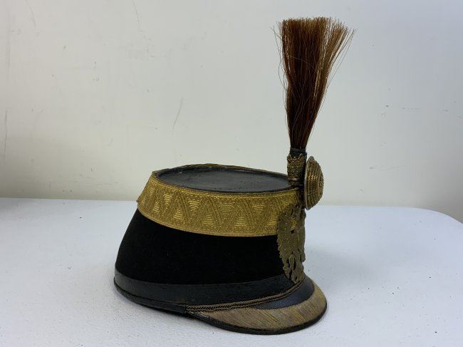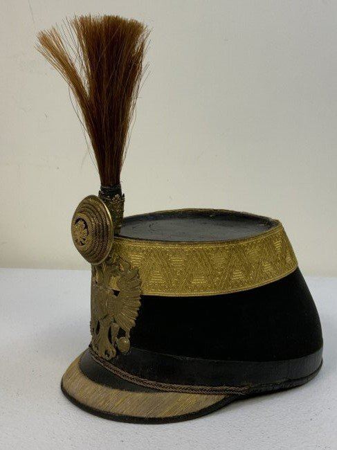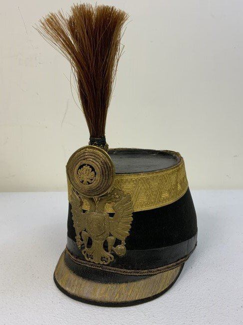 ANTIQUE AUSTRIAN HUNGARIAN K.U.K. OFFICERS SHAKO CAP HAT . GREAT CONDITION FOR ITS AGE . C. LATE 19th CENTURY . PARADE HORSEHAIR PLUME WITH GOLD WIRE EMBROIDERED COCKADE . RARE.