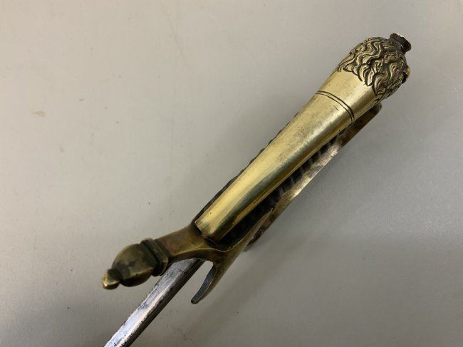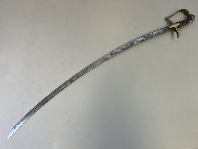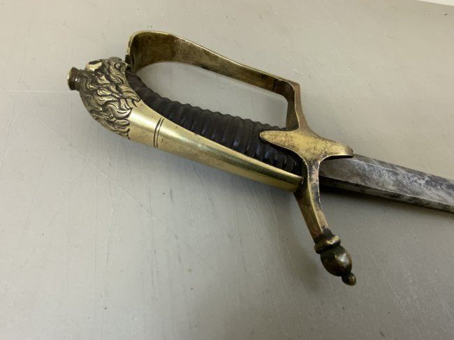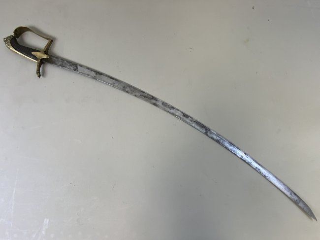 NAPOLEONIC WARS PERIOD BRITISH HUSSAR SWORD LION HEAD . VERY GOOD CONDITION FOR ITS AGE. BRASS HILT WITH LION HEAD . NICE CURVED BLADE IS STILL SHARP . NO SCABBARD . RARE .38" LONG WITH 32.5 LONG BLADE