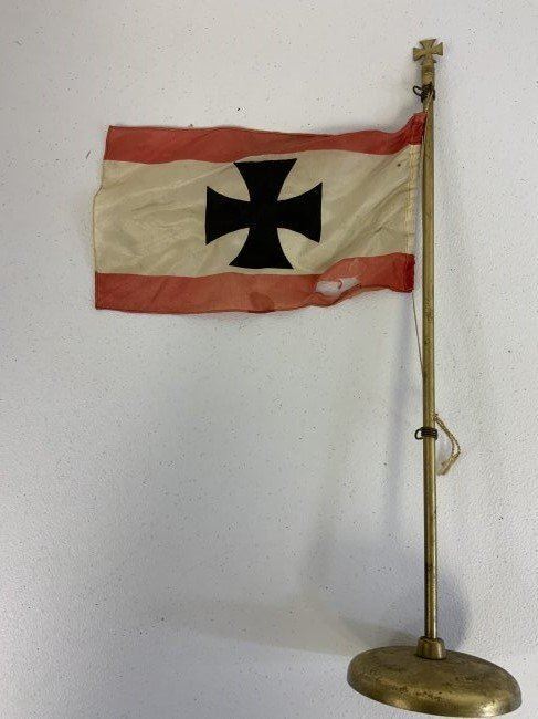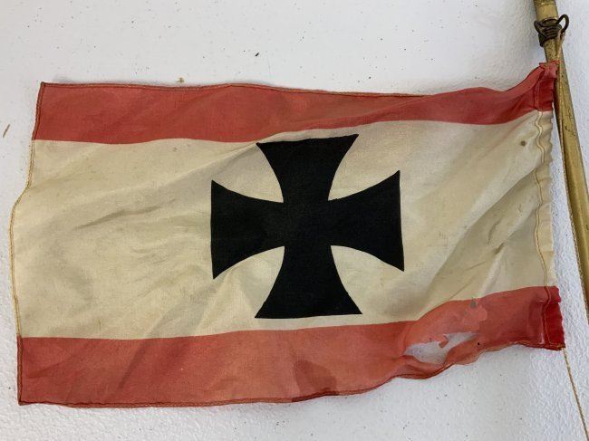 ANTIQUE GERMAN HANSA STEAMSHIP COMPANY TABLETOP FLAG . 10 X 6 FLAG WITH SOME TEARS . MOUNTED ON GILDED METAL FLAG POLE WITH CROSS TOP 18.5" TALL.DDG Hansa, short for Deutsche Dampfschiffahrts-Gesellschaft Hansa (German Steamship Company Hansa was a major German shipping company specialising in heavy freight and scheduled traffic between Europe and the Far East. Founded in Bremen in 1881