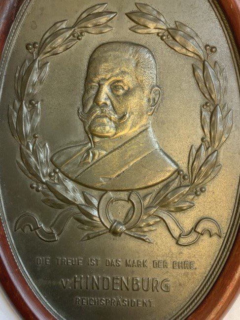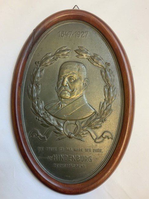 ANTIQUE GERMAN PAUL VON HINDENBURG BRASS PLAQUE . OVAL PLAQUE WITH 1847-1927 DATED. FRAMED IN A WOODEN FRAME. FRAME HAS A REPAIRED CRACK IN ONE SPOT. HANGING LOOP ON THE BACK . ABOUT 11 X 7.