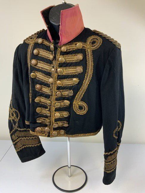 ANTIQUE HUSSAR UNIFORM PELISSE JACKET. EUROPE , MID 19th CENTURY STYLE. VERY GOOD CONDITION FOR ITS AGE . OLD NAME TAG INSIDE THAT'S HARD TO READ . GREAT DISPLAY PIECE .