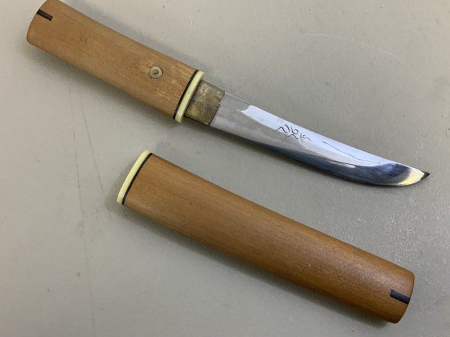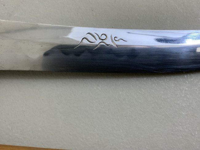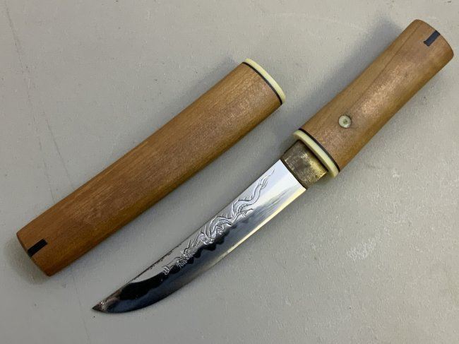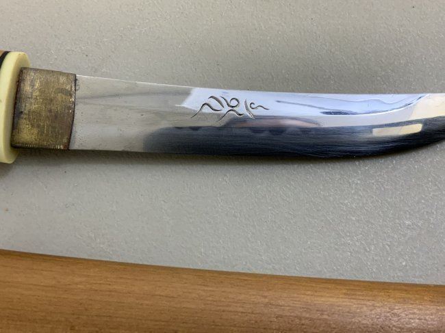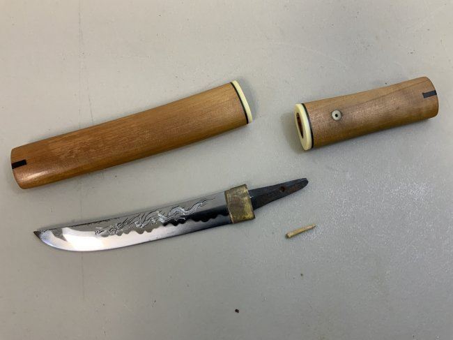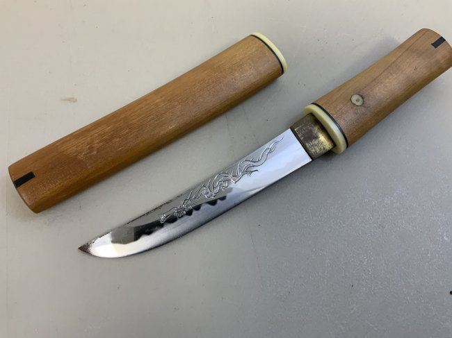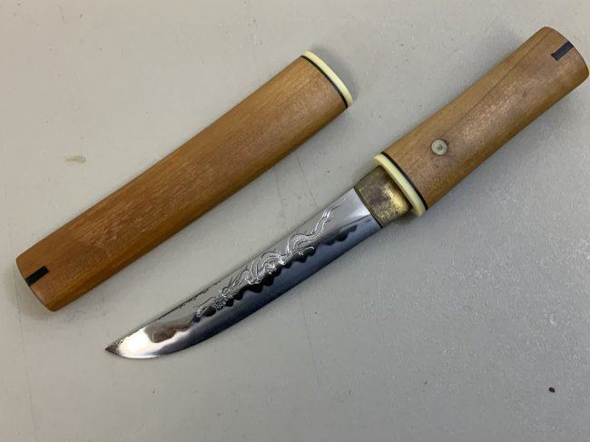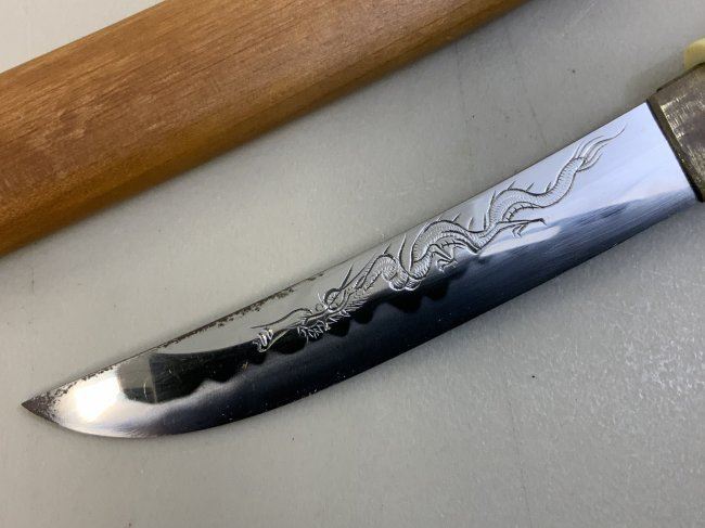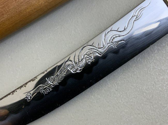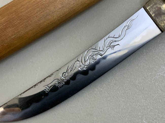 ANTIQUE JAPANESE TANTO SEPPUKU HARAKIRI DAGGER. RARE ! CARVED HORIMONO DRAGON ON THE BLADE . BEAUTIFUL WAVY HAMON .RAZOR SHARP BLADE IN FULL POLISH WITH SOME MINOR CORROSION AT THE VERY TIP AND SHOULD CLEAN UP NICELY. SUPER NICE AND CLEAN CONDITION INCLUDING WOOD SHEET . 9 1/8" LONG WITH 5" BLADE .
