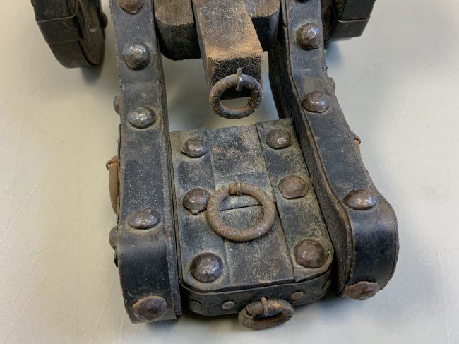 ANTIQUE MODEL OF A BRASS CANNON WITH WOODEN WHEELED MOUNT. VERY HIGH QUALITY MADE WITH THE ATTENTION TO ALL TINY DETAILS. BRONZE CANNON. WOOD AND METAL MOUNT. GREAT DISPLAY ITEM. 11" X 5 3/4