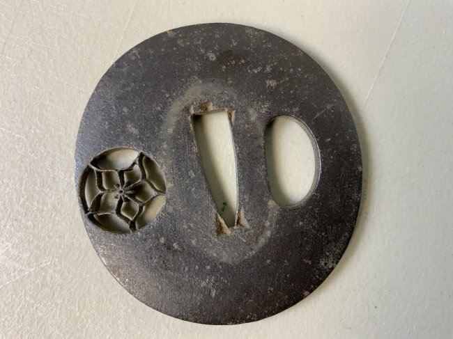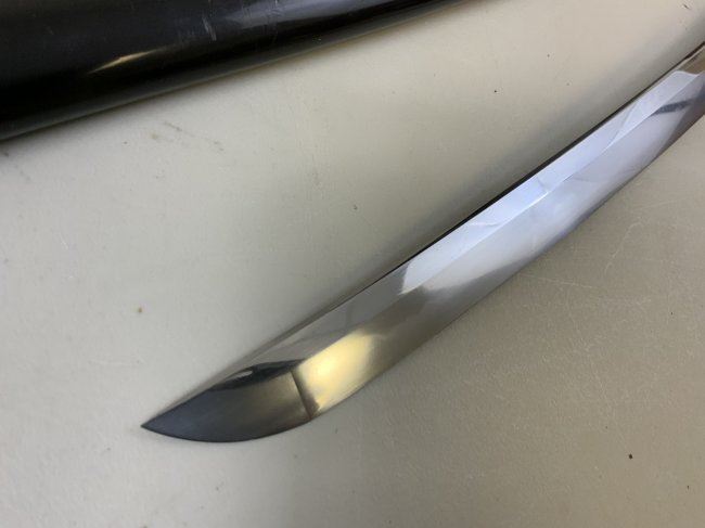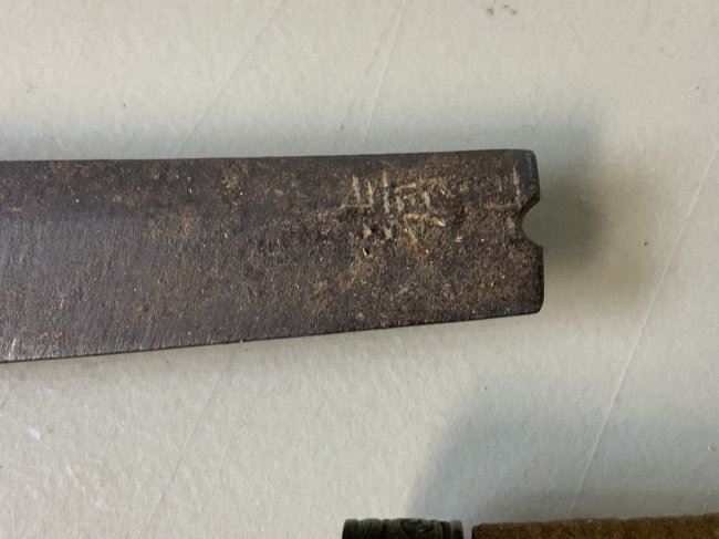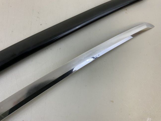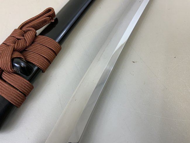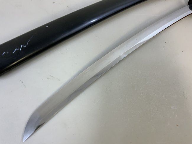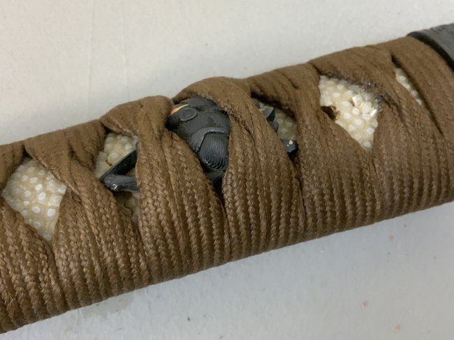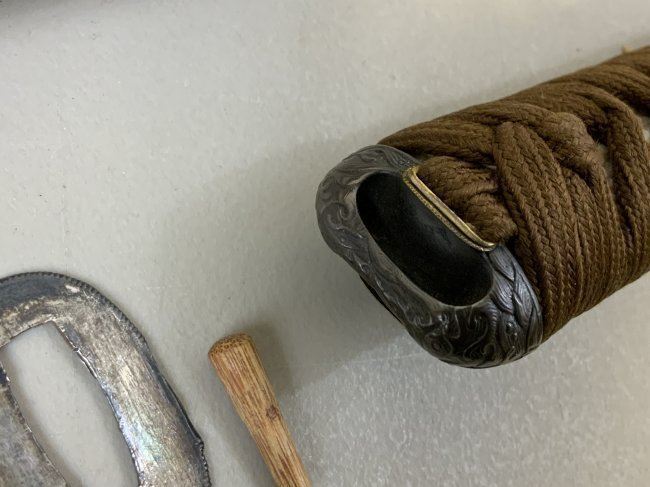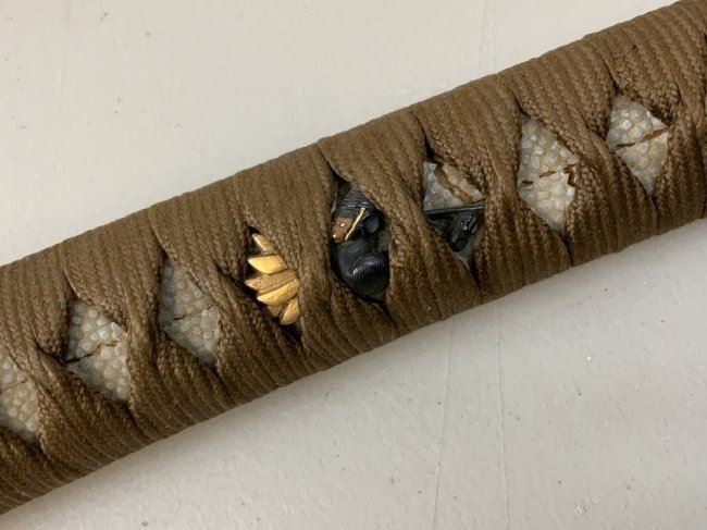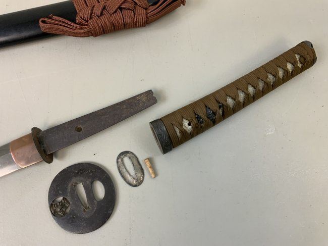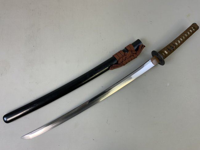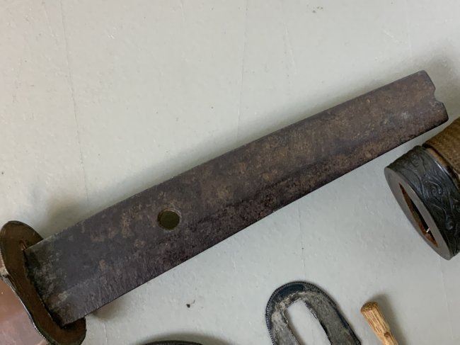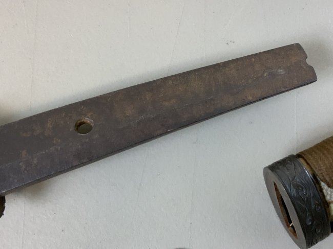 ANTIQUE OLD JAPANESE WAKIZASHI SAMURAI SWORD . BEAUTIFUL OLD SWORD. BLADE HAS A VERY BEAUTIFUL WAVY HAMON WITH NO FLAWS AND IN GREAT POLISH STATE. VERY OLD PIERCED IRON TSUBA AND BEAUTIFUL DECORATED FITTINGS. ANTIQUE SAYA SCABBARD IS IN GREAT CONDITION COMPLETE WITH BROWN ITO . THE TANG DISPLAYS A GREAT AGE AND HAS 1 MOUNTING HOLE AND EVIDENCE OF BEING SHORTENED AT THE END HAD ANOTHER MOUNTING HOLE AND A SIGNATURE SYMBOL STILL THERE. 31" LONG WITH 22" BLADE. NICE OLD SWORD.