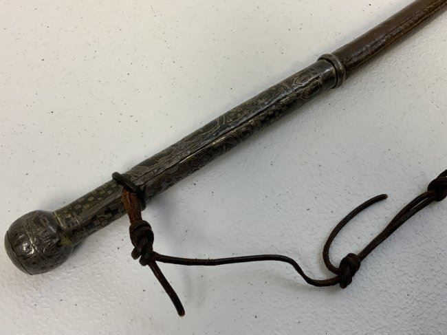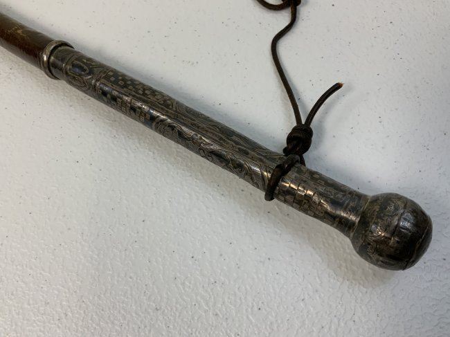 ANTIQUE RUSSIAN COSSACK CAUCASIAN HORSE RIDING WHIP. SILVER AND NIELLO HANDLE . LEATHER WHIP. COMPLETE AND IN VERY GOOD CONDITION FOR ITS AGE . NICE AGE PATINA ON SILVER FITTINGS . NICELY DECORATED. VERY HIGH QUALITY WORK . LEATHER WHIP IS COMPLETE AND IN GREAT CONDITION. 31" LONG. RARE !