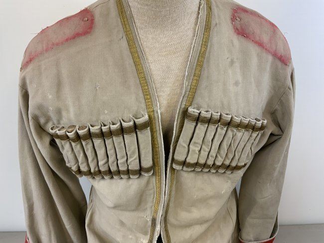 ANTIQUE RUSSIAN COSSACK UNIFORM DRESS CHERKESKA . SHOWS A GREAT AGE AND WEAR. AROUND WWI ERA. REMOVED SHOULDER BOARDS AND YOU CAN SEE THE RED COLOR OUTLINE WHERE THEY USED TO BE ATTACHED. MANY OLD PERIOD REPAIRS . GREAT EXAMPLE