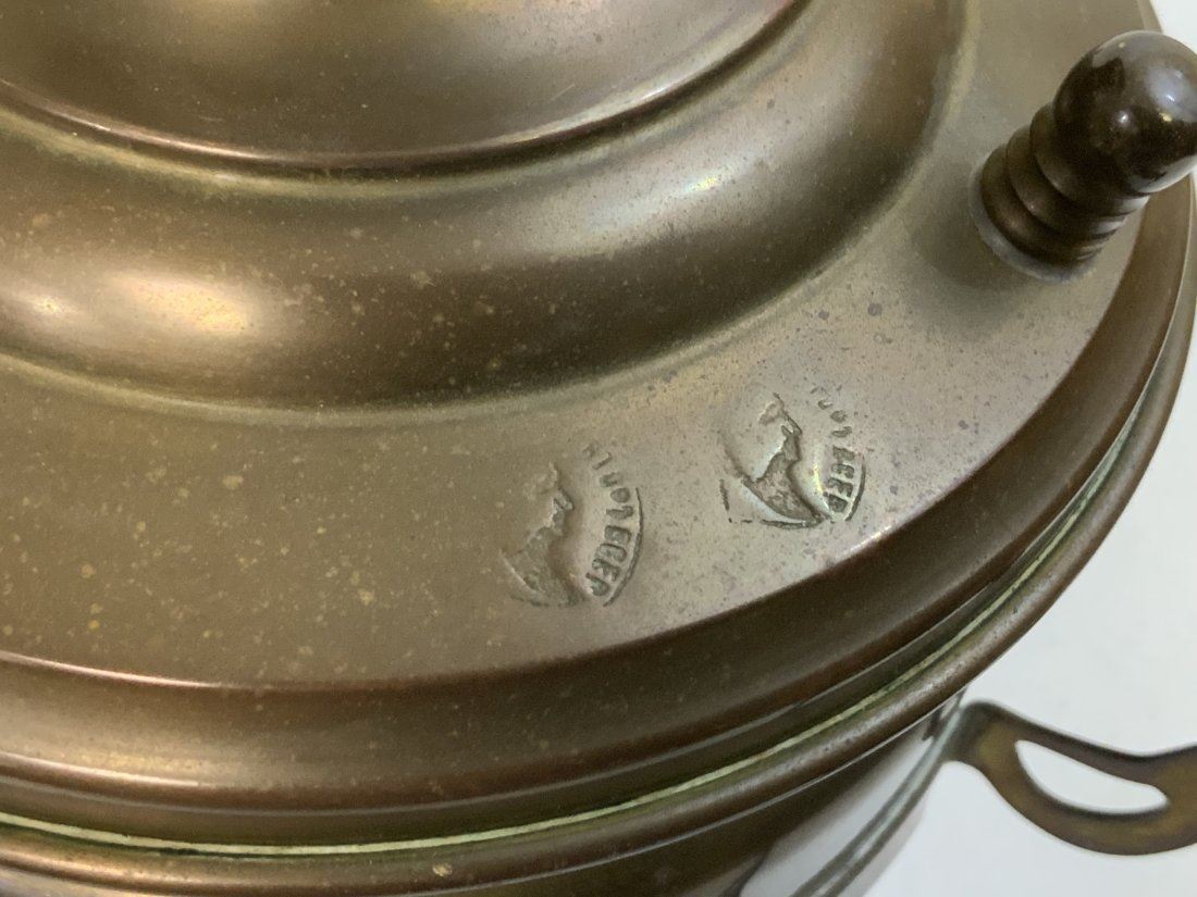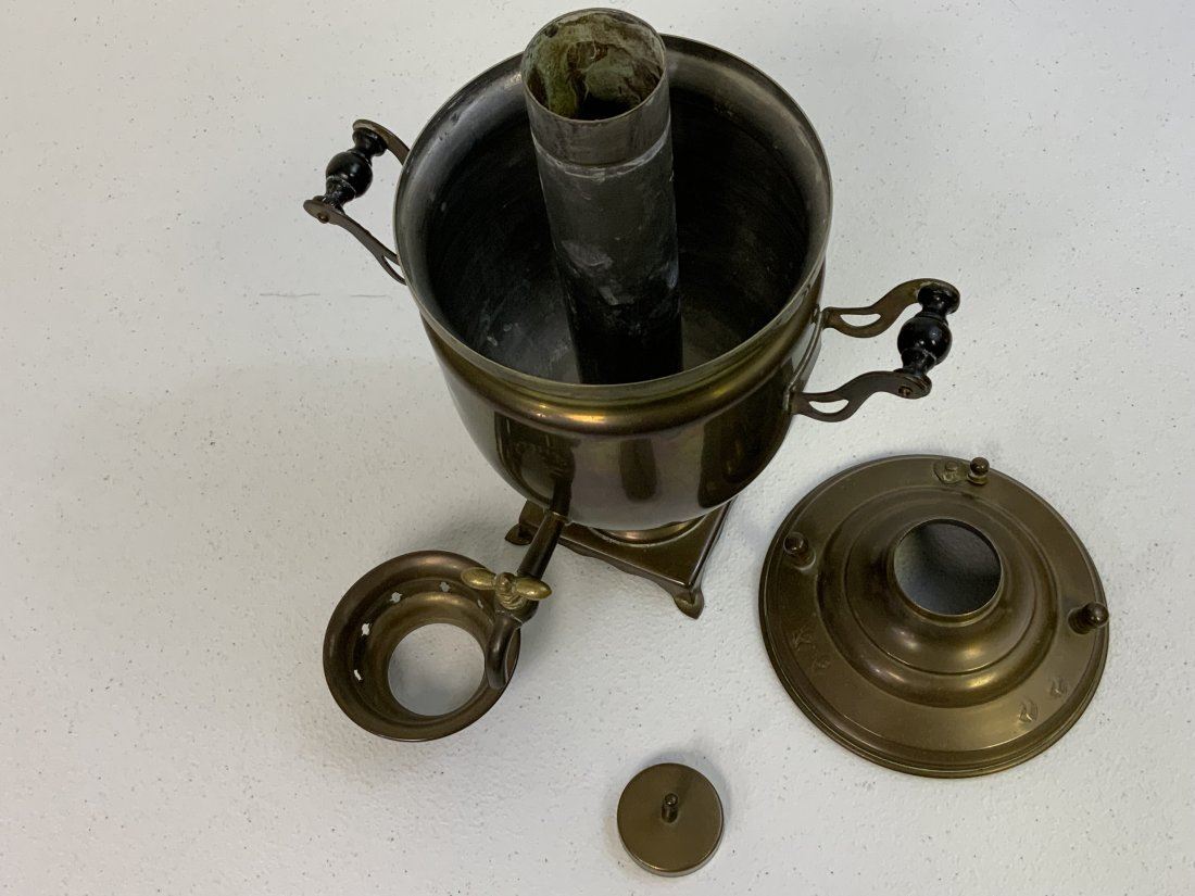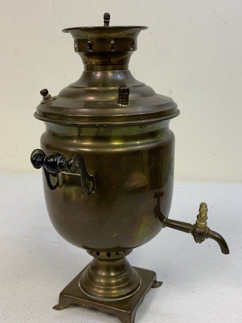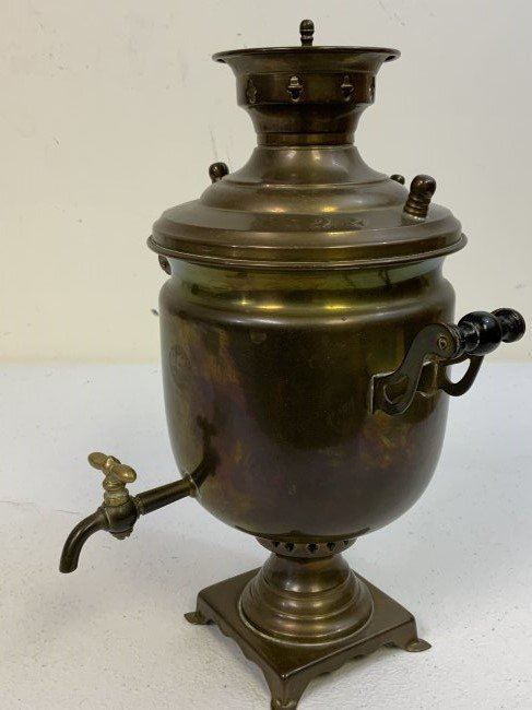 ANTIQUE RUSSIAN SMALL SIZE BRASS SAMOVAR TEA KETTLE . GREAT CONDITION . MAKER MARKS. GREAT DECORATOR.