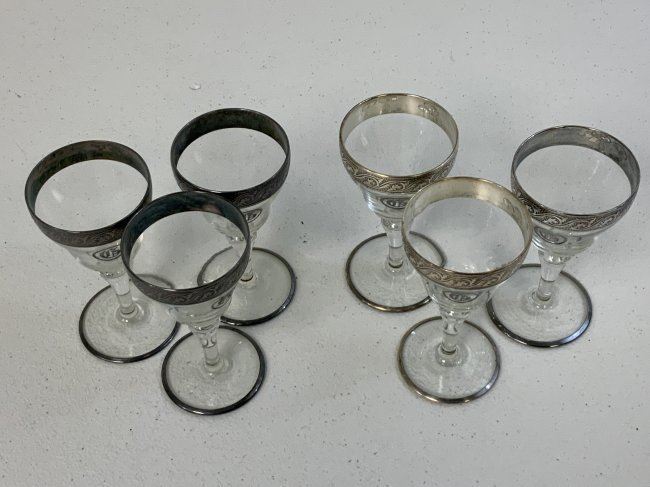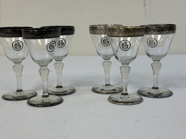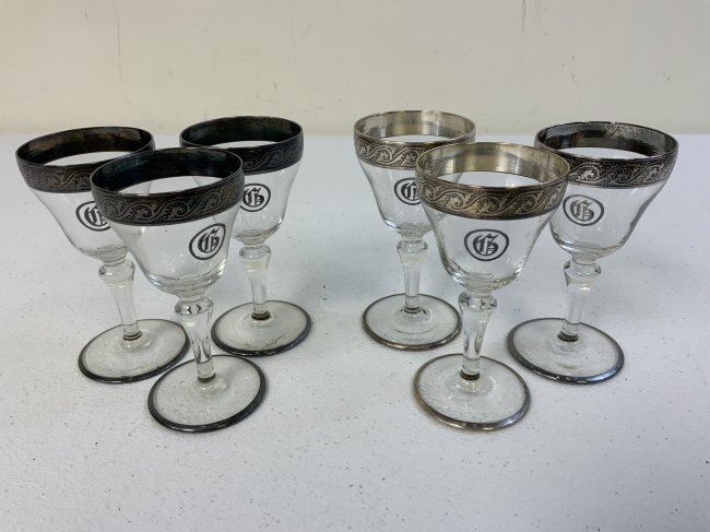 ANTIQUE SILVER AND GLASS SET OF 5 WINE / LIQUOR GLASSES WITH MONOGRAM