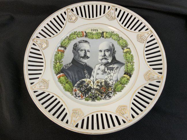 ANTIQUE WWI ERA IMPERIAL GERMAN PORCELAIN PLATE AUSTRIAN AND GERMAN EMPERORS . 10" DIAMETER .