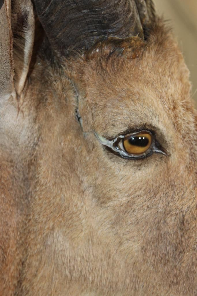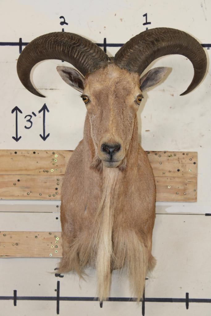 AOUDAD Shoulder Mount. The Left Horn measures 24.75" Long and the Right Horn measures 24.25" Long. It has some cracks and splitting around the temple areas and both eyes. TAXIDERMY