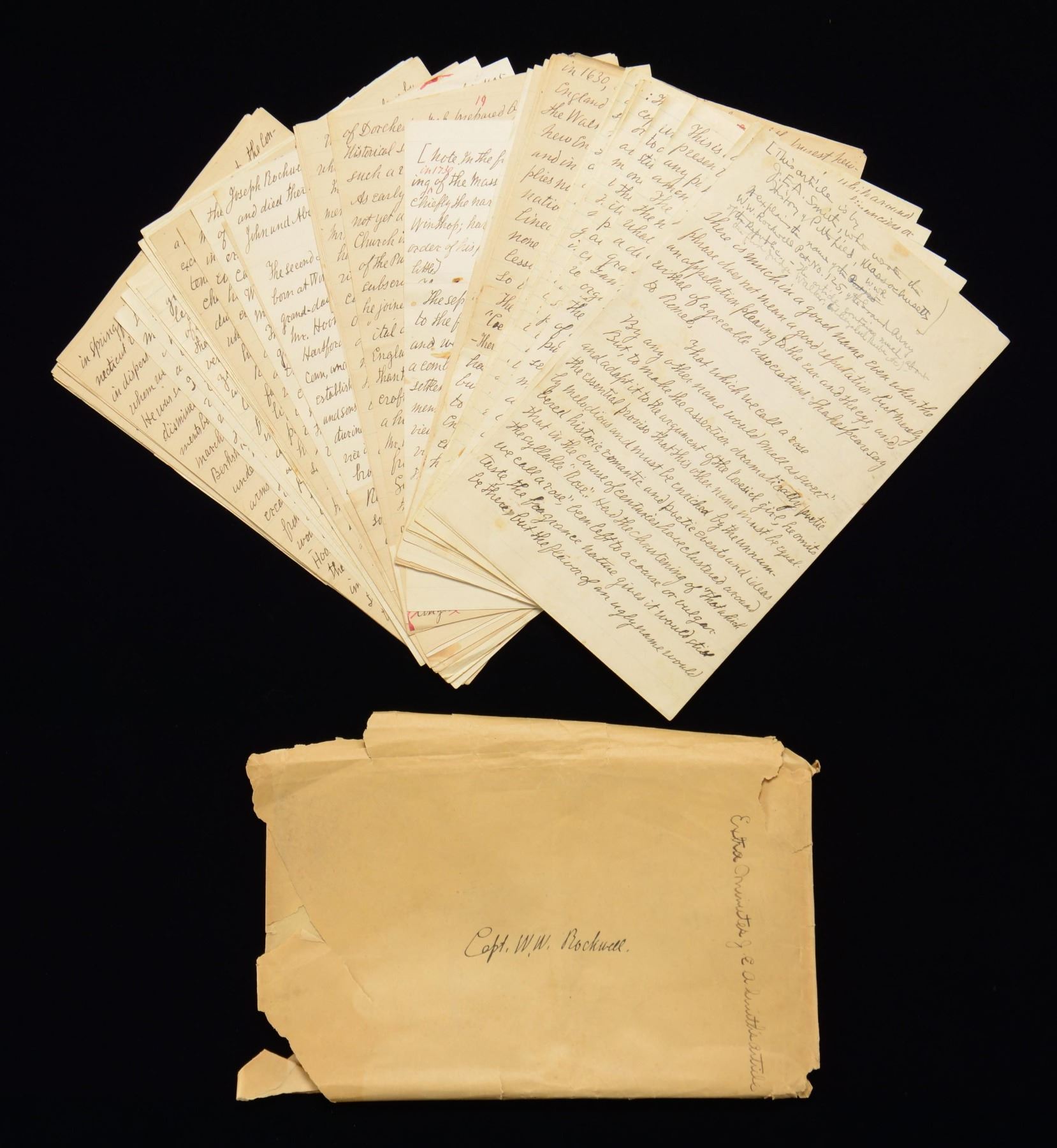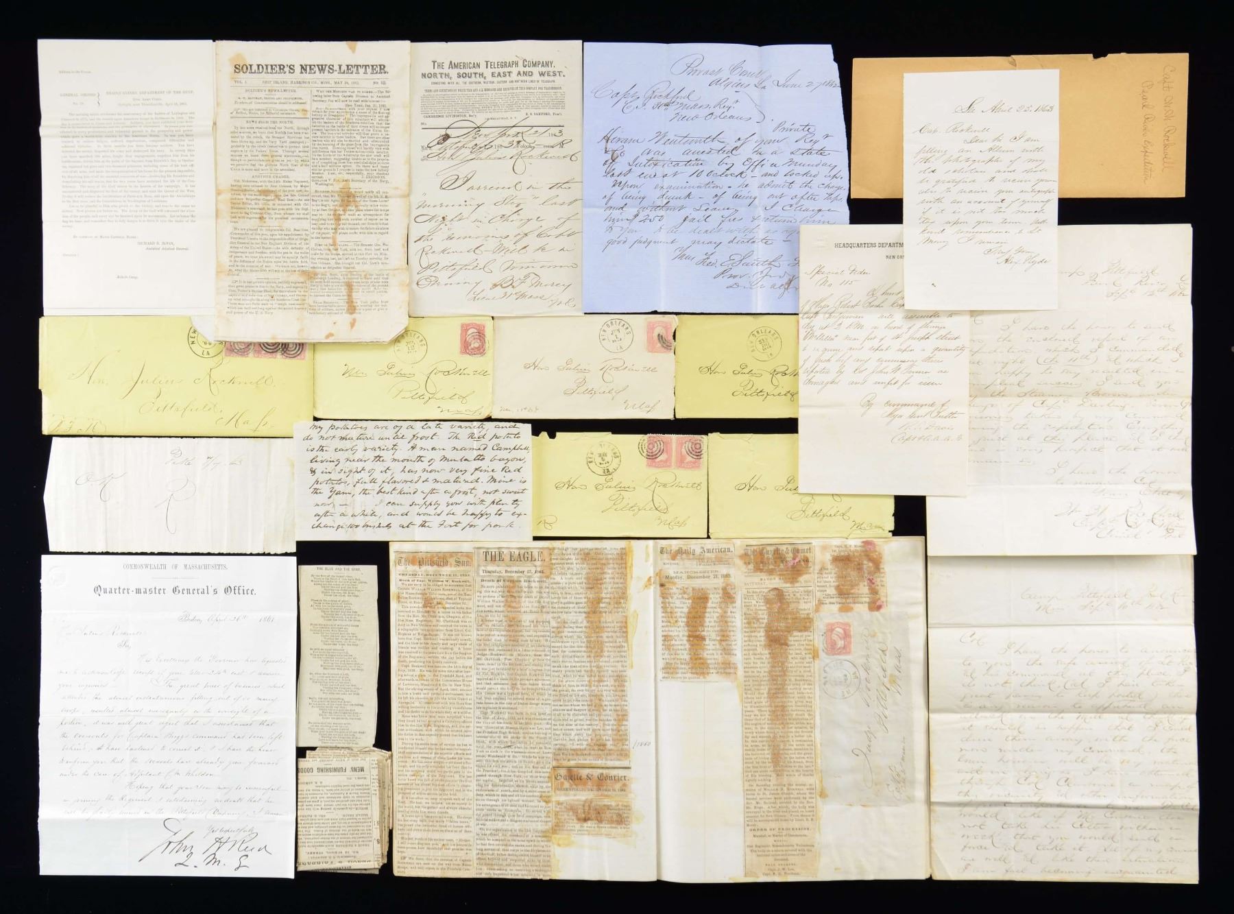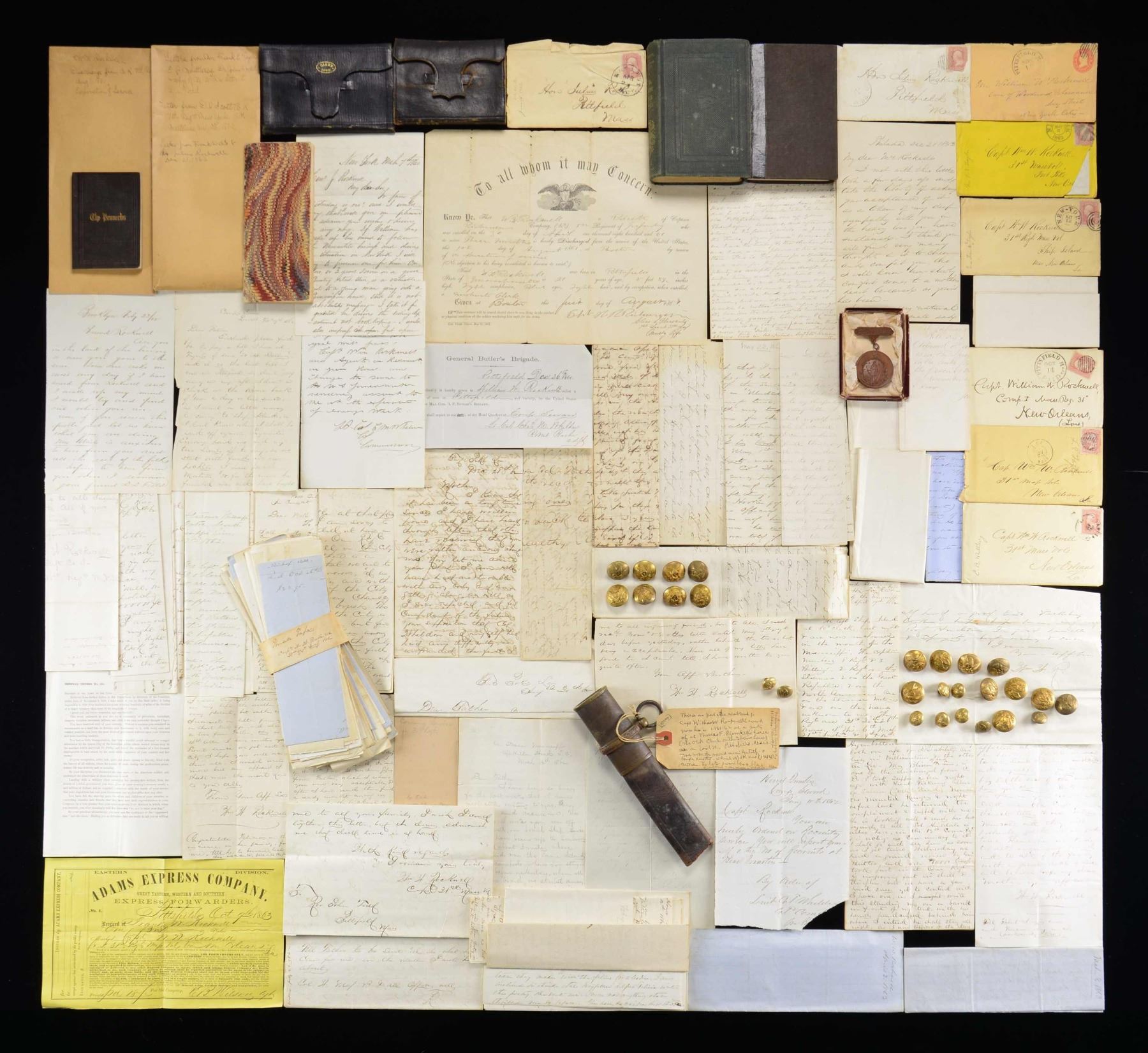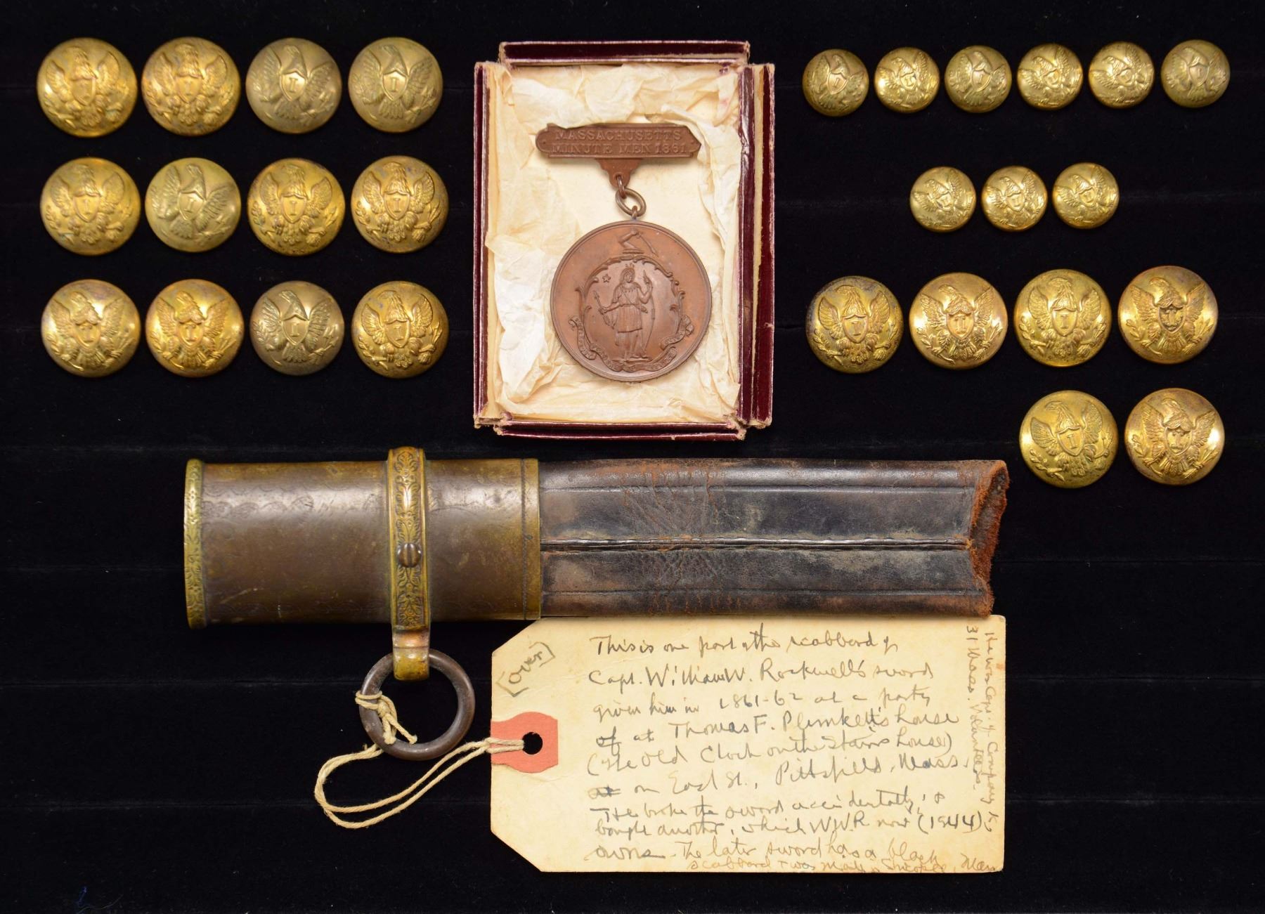VOLS. This large archive consists of several hundred letters and documents, diaries and personal effects of Capt. Rockwell when in New Orleans before his death December 3rd 1863. 1) 27 eagle "I" buttons from his uniforms, 18 large & 9 cuff size, very good overall. 2) Sword scabbard throat with tag explaining that this one broke and another was bought. 3) US Infantry Tactics, inscribed "Wm W Rockwell / Capt. 31st Mass vols / comdg I Co / Fort Pike / Feby 9, 1863" very good with decorated spine. 4) Hardee's Tactics, "Capt. Rockwell / Co. I / 31st Regt" inscribed inside. 5) Webster's Army & Navy Pocket Dictionary, inscribed "Wm W Rockwell / Capt. 31st Mass / Fort Pike La/ July 20, 1863" very good with gold lettered spine. 6) Proverbs, inscribed "Capt. Rockwell from his friend Capt. Allen, Oct. 17, 1863", very good. 7) Massachusetts Minute Man medal in original box inscribed on edge "WILLIAM W ROCKWELL, PVT, CO, K, 8TH REG", medal is like new. 8) 2 diaries, one with little content, the other filled from 1st to last page starts Feb 21, 1862 through May 3, 1862. Inscribed on inside cover "Sixty eight days from Boston to New Orleans 1862 / by William W Rockwell / Capt. 31st Mass", very good. 9) Over 200 letters & documents categorized in 20 large envelopes by family member after his death. Letters are generally fine condition and folded to fit the large envelopes. William wrote letters home to his mother and his father which were retained as were letters written by his parents to him in New Orleans. Many of the letters still have there original covers and stamps. William received letters from friends at home and other soldiers in the field. Many letters refer to business in New Orleans, both personal and military, very good overall. 10) 3 printed General Orders from New Orleans, very good as folded. 11) Rare field press "SOLDIER'S NEWS-LETTER" published on Ship Island Mississippi, May 24, 1862, where the 31st was garrisoned at one point, good. 12) Two 1862 New Orleans newspapers, DAILY DELTA, May 15, 1862 & May 5, 1863, fair to good. 13) File of letters & documents concerning William's death, original eulogy, very good. 14) 10 larger photographs of William postwar made for family, fine. 15) Memorial escutcheon of Co. "I" 31st Mass mentioning William's death, mostly complete, but frayed & torn edges. (02-22987-10/JS). NON-GUN. $3,000-5,000.