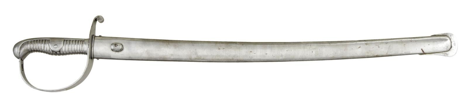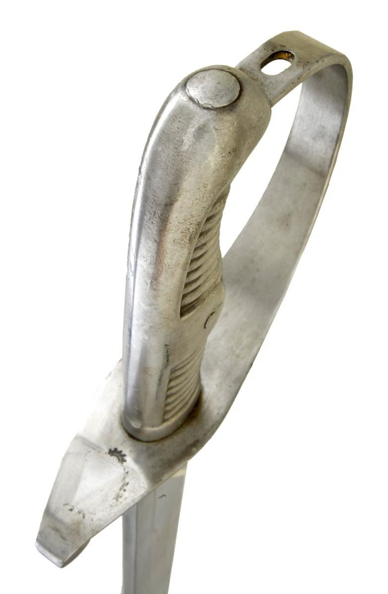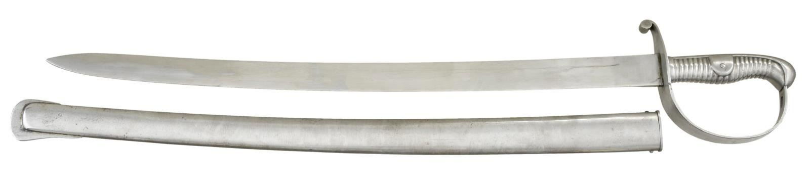 Overall length: 33". Blade length: 26 1/4". Blade has a single wide fuller on one side and is marked on the ricasso “WEYERSBERG KIRSCHBAUM & CO SOLINGEN”. Steel hilt with turned down quillon. Plain guard with bird’s head pommel. Grip is also ribbed steel with ears on either side. Steel scabbard with frog stud. CONDITION: both sword & scabbard show light wear overall with a shiny finish. (02-19384/BF). $300-400.