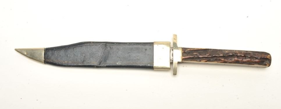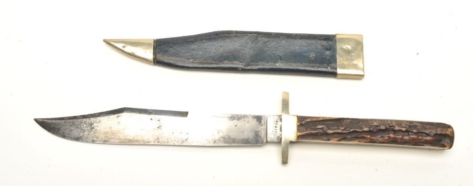 ARR-1 TAYLOR EYE WITNESSTaylor “Eye Witness” clip point knife in good condition showing radical clip and German silver mounts stag grip. Measures 12 ¾” overall with 7 ¾” blade. Very good condition with full dimensions to the blade and mostoriginal polish with some minor pitting. Marked at ricasso with “Eye” and “Witness”. The original scabbard is also good to very good missing button for hanging. Est.: $400-800Taylor “Eye Witness” clip point knife in good condition showing radical clip and German silver mounts stag grip. Measures 12 ¾” overall with 7 ¾” blade. Very good condition with full dimensions to the blade and mostoriginal polish with some minor pitting. Marked at ricasso with “Eye” and “Witness”. The original scabbard is also good to very good missing button for hanging. Est.: $400-800