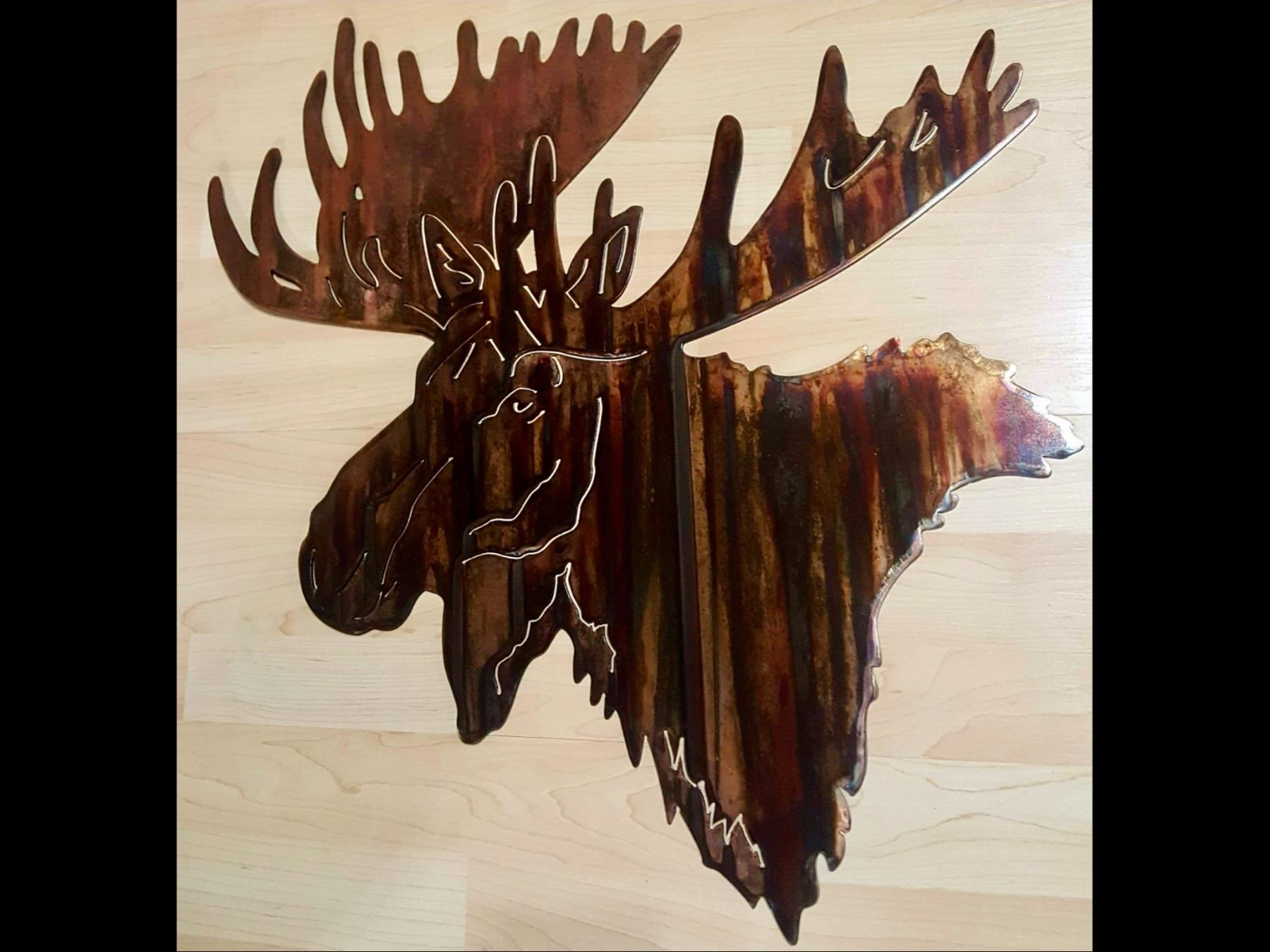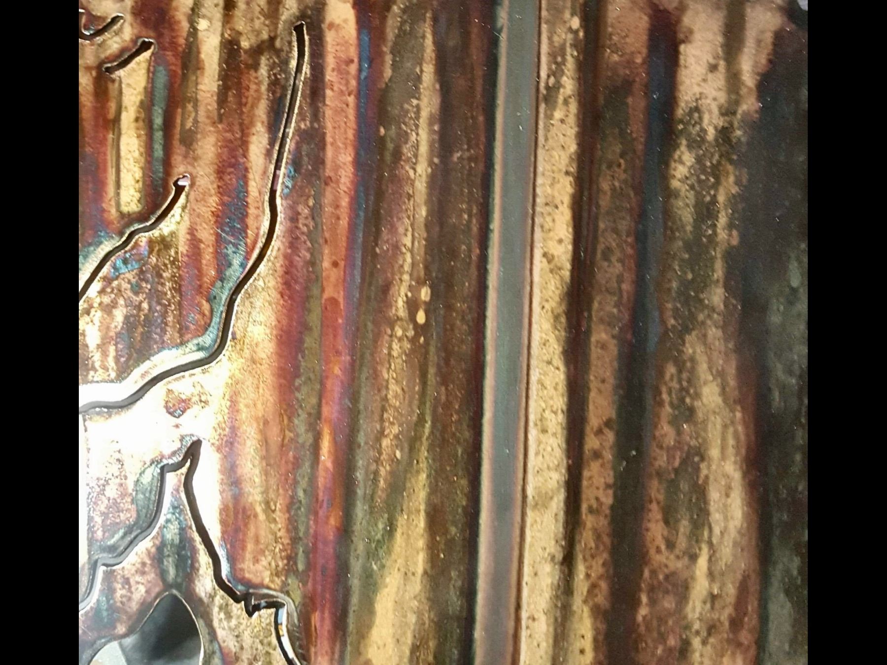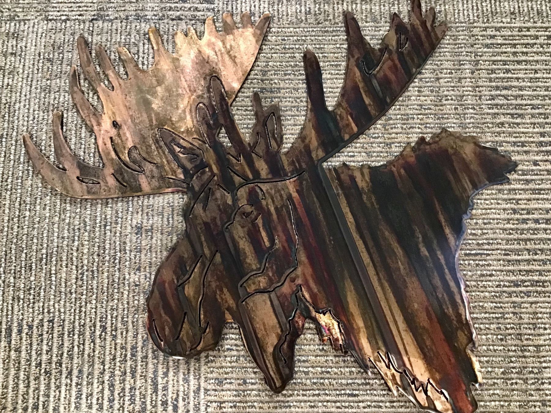 This elaborate artisan piece was made and donated by local Wyoming artist Tammy Bradshaw. It measures a beautiful 26” tall and 24” wide. The piece is done by a process known as “acid finish”. The outcome depends on what the acid wash does to the metal and how the metal is ground. Therefore each piece is a one of a kind. It is on copper colored metal with undertones of dark olive greens, rusts and browns. It is ready for hanging with a hole placed discretely at the top.