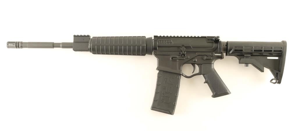 Semiautomatic rifle features 16" barrel with M4 groove, flash suppressor, Picatinny rail on top of receiver and gas block, no sights or optic included, polymer upper and lower receivers, forward assist, ejection port cover, collapsing stock, single point sling attachment points at receiver rear, manual safety. Bore is excellent. Metal is 98% or better black parkerized finish with some light scuffs on barrel. Black polymer parts are excellent, like new. Includes one 30 round polymer magazine, original factory cardboard shipping box, cable lock, manual. Condition is NRA Excellent - Like New *** Modern Firearm ***