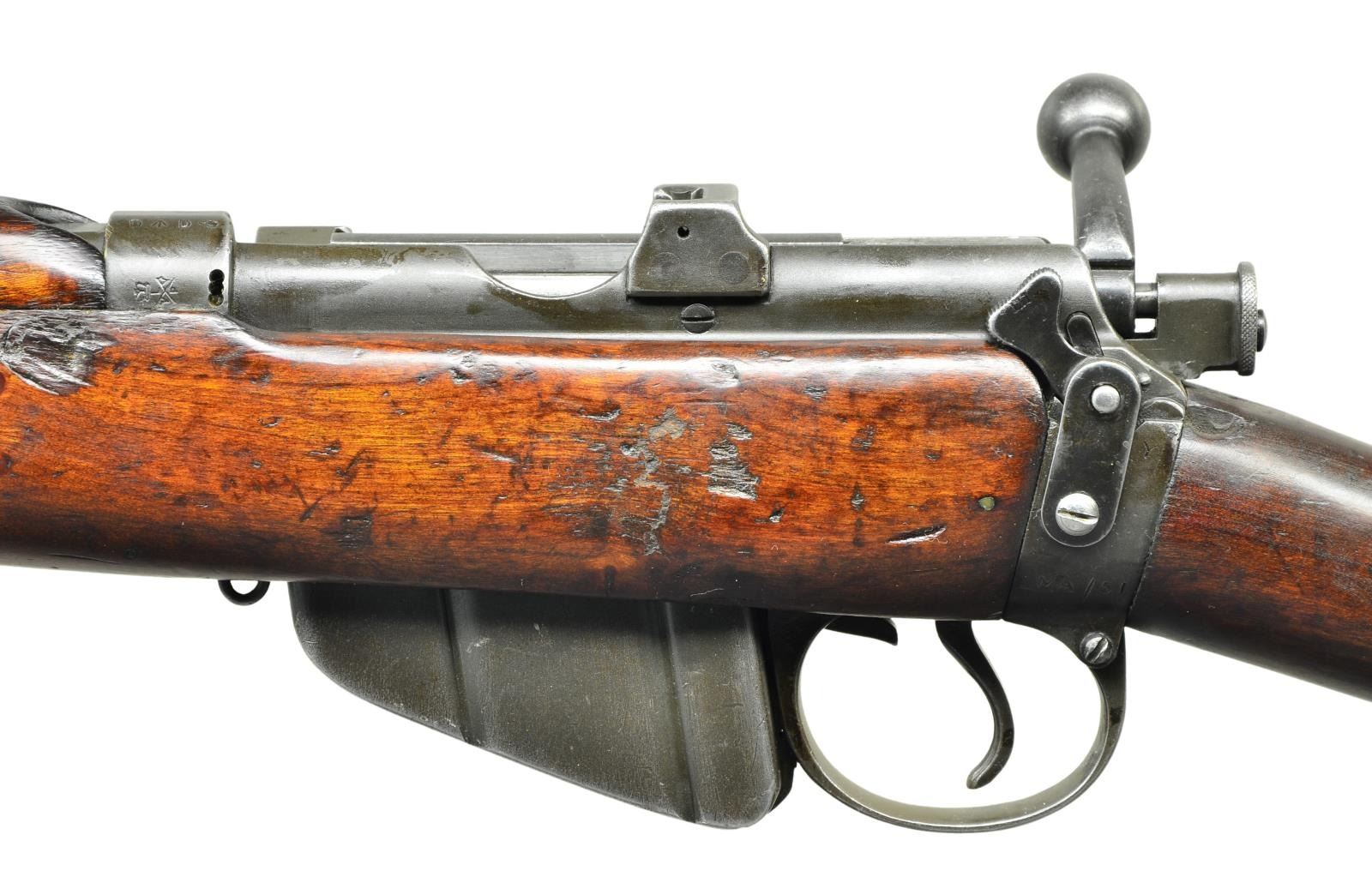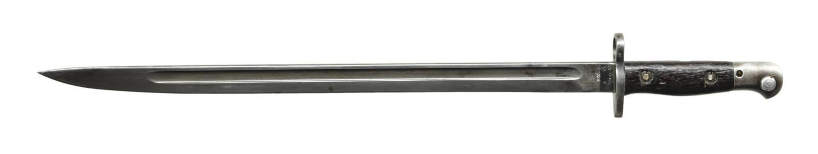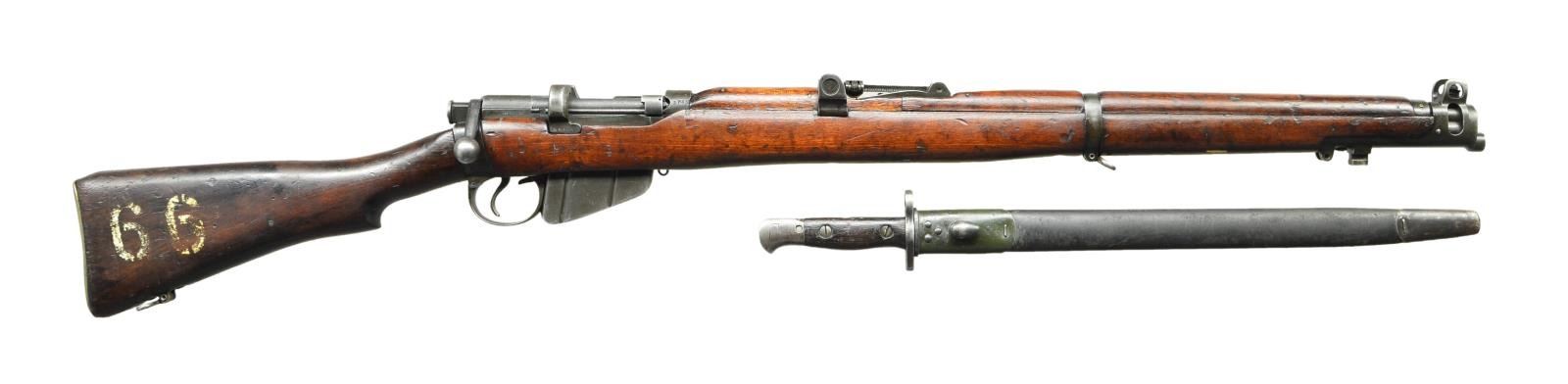 MILITARY RIFLE. Cal. 303 British. S# B97853. Import marked on right side of receiver. S# matches on receiver, bolt, rear sight & forend. Bbl. 25". Tangent rear sight graduated to 400 yards. Blade front sight. Nose cap has protective ears & bayonet mount. Receiver is marked on right side of butt socket w/ "MA, LITHGOW, S.M.L.E. III* 1941". Receiver ring is marked on top right "FTR" indicating factory thorough repair. Marked on top left side "D" broad arrow "D" indicating Australian ownership mark which was used from the mid 20s to the Vietnam War era. Round type cocking piece. Hardwood stock set. Buttstock is marked on right side in white & retains traces of original acceptance mark which include III* & 1943. Brass trap buttplate. Forend has remnants of white painted rack number. UNATTACHED ACCESSORIES: 16 7/8" fullered blade bayonet marked on left ricasso w/ crown "JP 1907 ANDERSON" & "view marks". Right ricasso marked w/ broad arrow "X" & view marks. Straight crossguard. Smooth walnut grips. Bird's head pommel. Pommel has added brass insert in bayonet lug slot. Leather scabbard w/ green painted metal throat & tip. Leather scabbard is marked on back w/ "W". Bayonet has been sharpened. Metal parts have wear turning gray & patina. Grips have wear & small crack on left grip. Scabbard is worn w/ scuffing, but has tight stitching & appears serviceable. CONDITION: original finish stock set has wear, staining & handling marks commensurate w/ hard service & hard environments. Metal retains 50% of its original finish w/ thinning, wear & handling marks. Bore is turning dark w/ light oxidation, but shows strong lands. (23-356/RW). CURIO. $300-500.