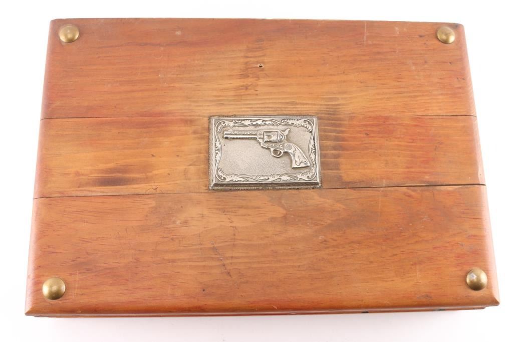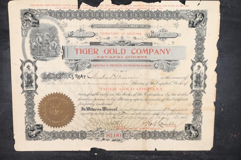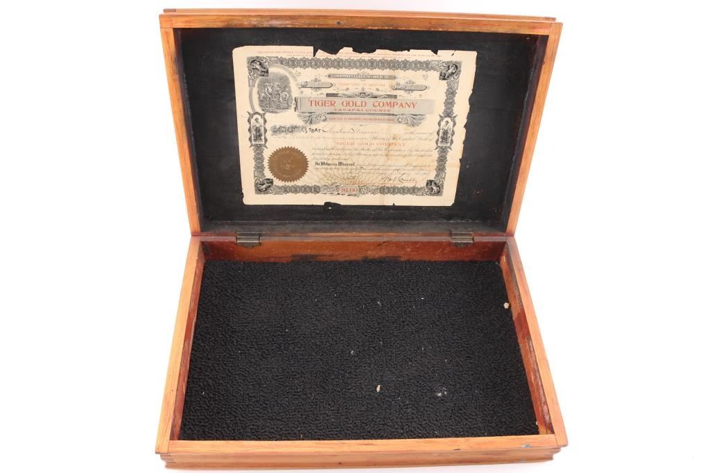 1903 dated stock certificate for Tiger Gold Company of Yavapai County. Stock is for 500 shares which were $1.00 each. Mounted in wood display case with embossed Single Action Army plaque on the lid.