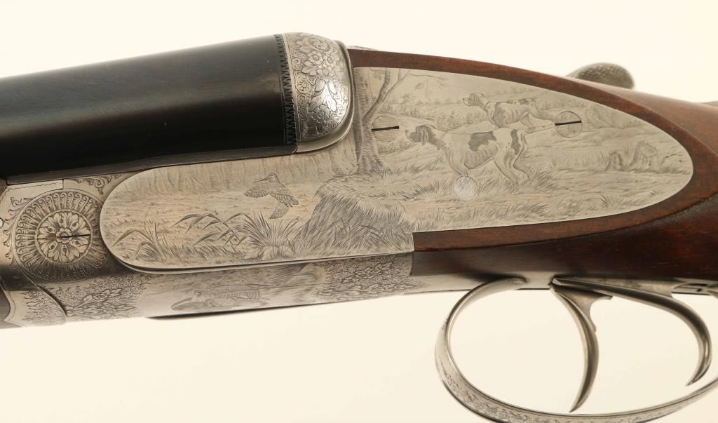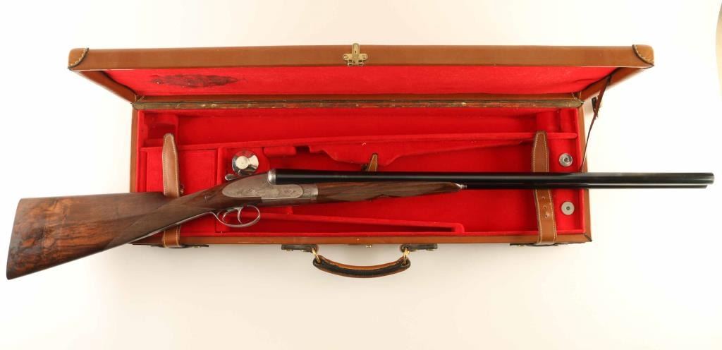 SN: 31885 'Venere Extralusso' Exquisite Bulino engraved side-by-side pinless sidelock double barrel shotgun chambered for 2 3/4" 12 gauge shells. Hand crafted in Brescia, Italy circa 1976 and masterfully engraved & signed by F. Galeazzi. Engraving consists of exceptionally well executed English rose & scroll with acanthus accents, and ultra fine realistic Bulino game scenes featuring: a proud pointer retrieving woodcock with trees in background on the underside of the receiver, and borderless scenes on the side locks which continue onto action. The left side depicts two pointer dogs flushing a woodcock in a marsh scene and the right side depicts two pointer dogs flushing a grouse in a field scene. Configuration: Blued 27" chopper-lump barrels with fixed modified/improved cylinder chokes & raised concave rib, silver bead front sight, selective automatic ejectors, bushed strikers, double triggers with front trigger articulated, coin finished receiver & sidelocks, sliding tang safety, knurled top lever, super fine point checkered fancy walnut splinter forend with Anson release and gold inlaid "FAMARS" crowned shield w/ oak wreath escutcheon, and straight grip shoulder stock with drop points & checkered bare butt. Stock dimensions: drop at comb 1.5", drop at heel 2", length of pull 14 3/8" and approximately 1/4" cast-off. The special steel barrels are hand finished and stamped by their craftsmen "MARIO", "REMO", "PRIMO", & "TONY". Includes a factory fine leather wrapped locking trunk case with partitioned interior lined in scarlet velvet. Case contains factory brochures, snap caps, a nickel plated oiler bottles and hand written & types notes from Jim Wilkinson. The barrels exhibit nearly all of their original deep lustrous bluing showing little to no visible wear. The coin finished receiver & sidelocks mirror the barrels in their finish retention but show a superficial brushed bright spot on the left side behind the fence. There is also a minute amount of fine surface rust observed on the interior of the polished receiver. One spot in the fine crevices surrounding the right firing pin bushing & lock screw and the second spot on the screw between the locking levers. Action is tight, the bores are pristine and the oil finished wood stocks are near fine showing five small filled in knots. Condition in near NRA Excellent. ***Modern Firearm*** [From the Jim Wilkinson Rifle Ranch Collection]