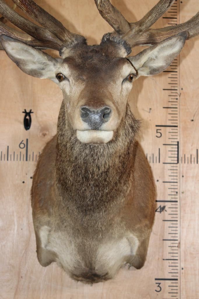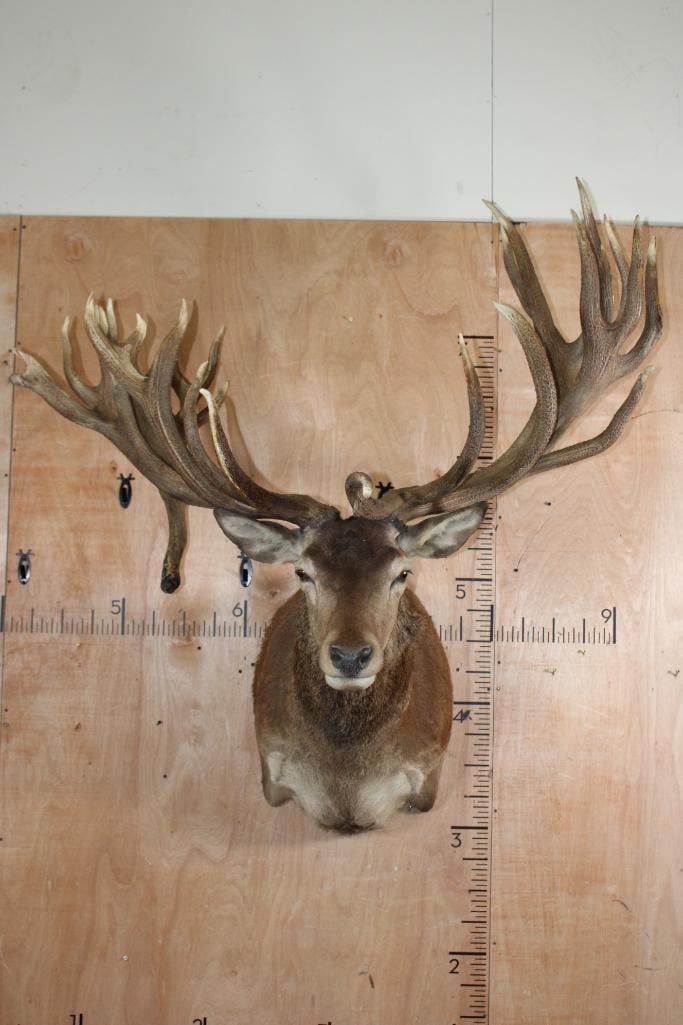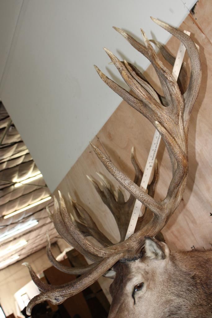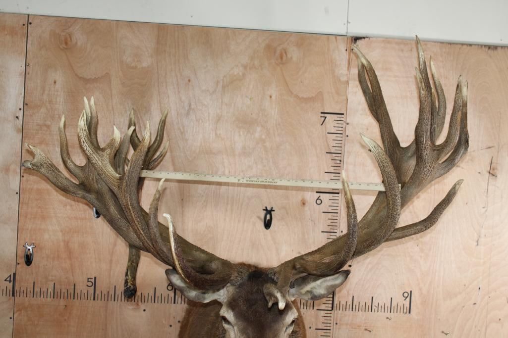 Absolutely Massive Very Nice, Clean, and Newer 31-Point RED STAG Shoulder Mount with a BIG Drop Tine. It has a 53" Spread and is in Very Good Condition. This may be the Biggest we've seen! TAXIDERMY