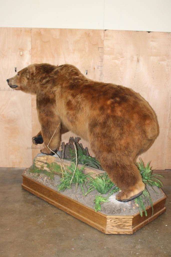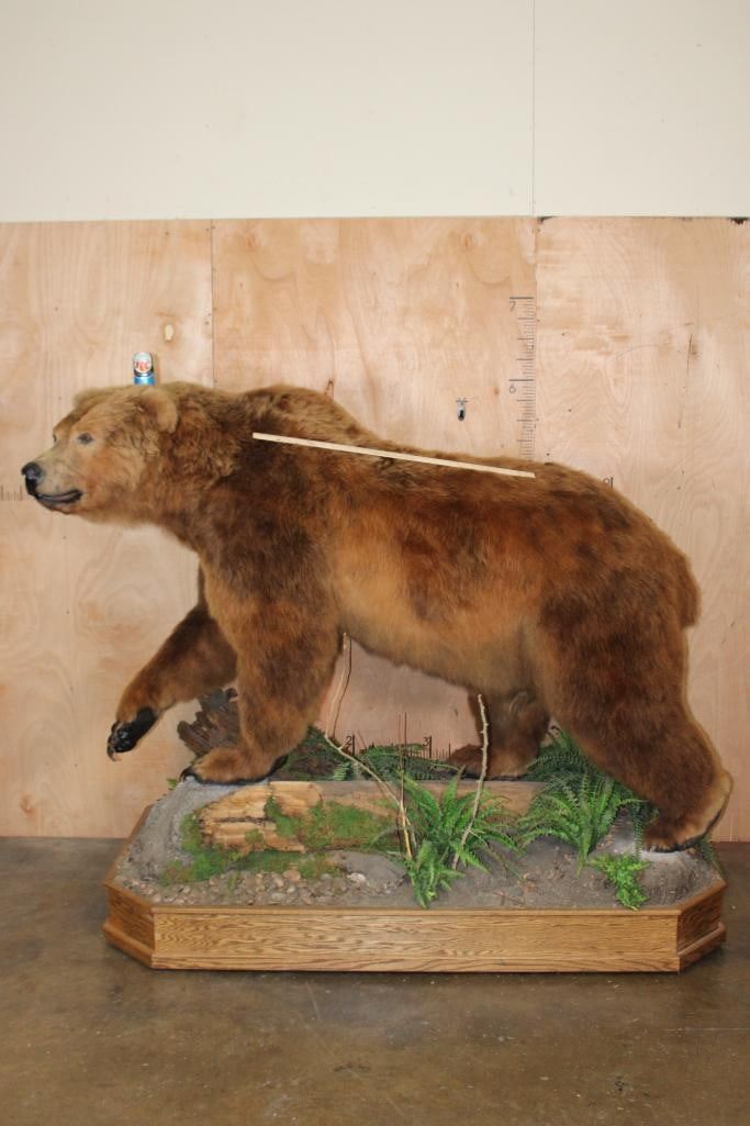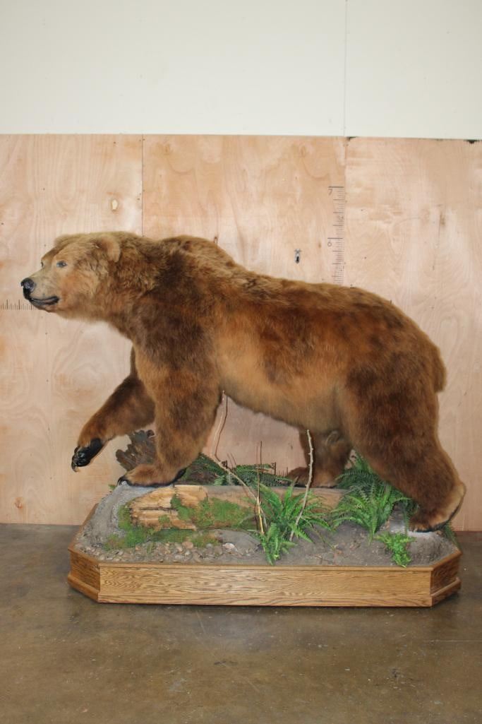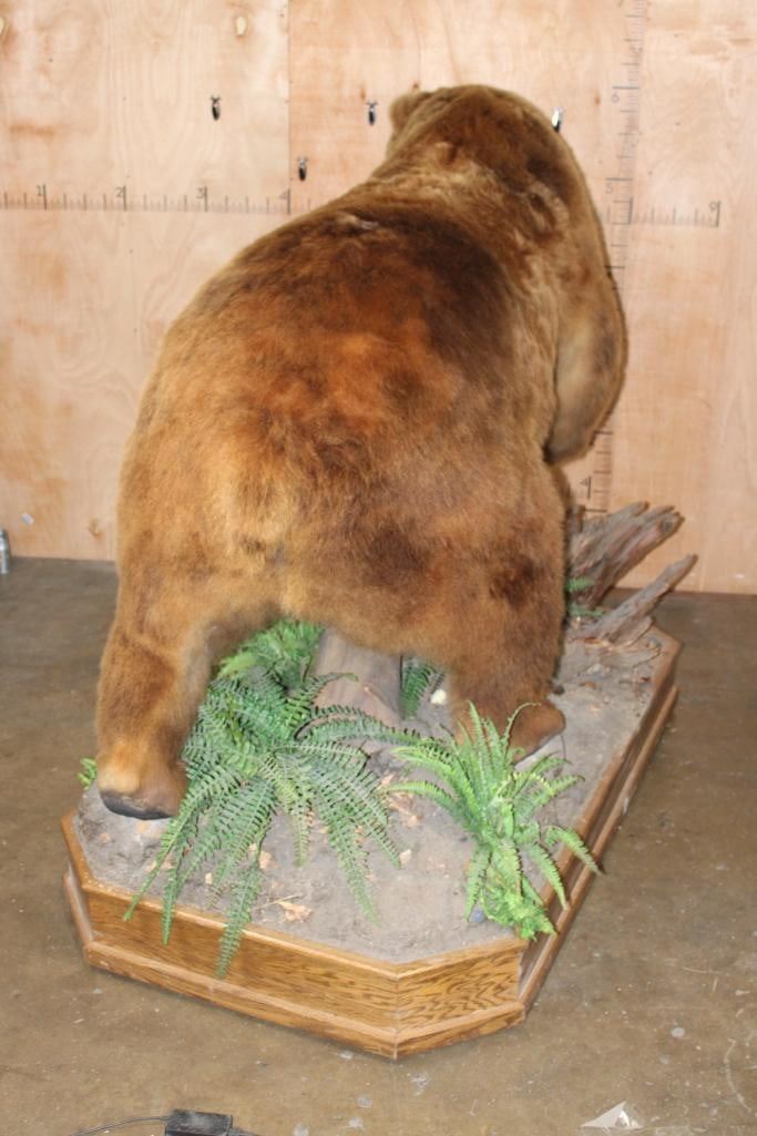 Absolutely Massive Life-sized BROWN BEAR. This is a Very Nice and Clean mount. It has All its Huge Claws and a Giant Head. The Brown Bear measures 108" Long from Nose to Tail! He is displayed on a decorative Wood Base with Wheels. The Total Mount measures 7' 1" Long x 45" Wide x 73" Tall. This is High Quality taxidermy in Very Good Condition. TAXIDERMY