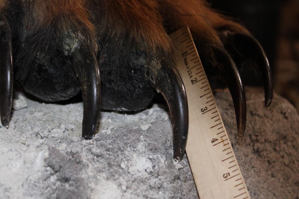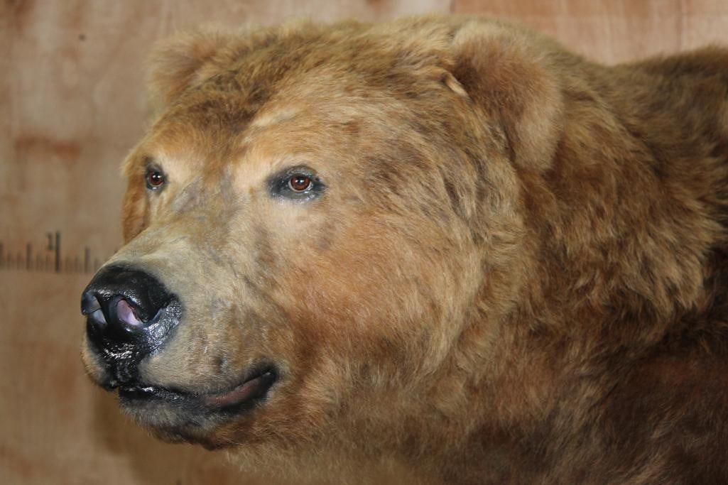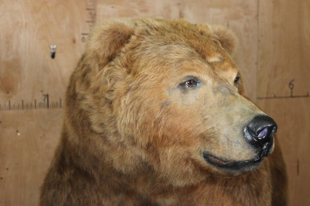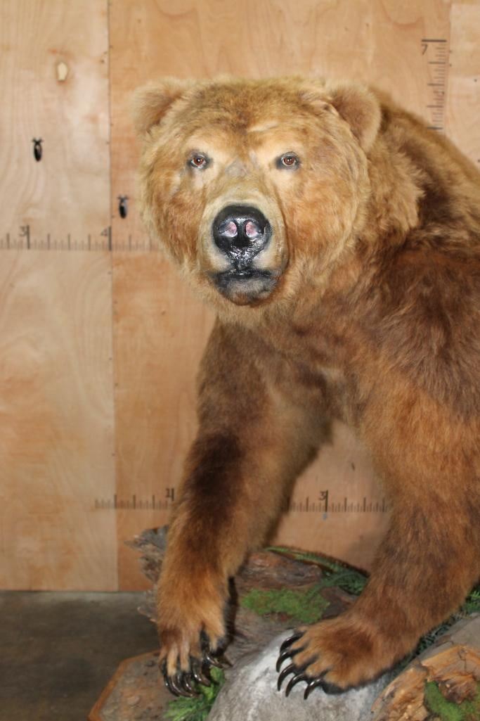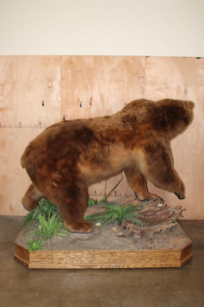 Absolutely Massive Life-sized BROWN BEAR. This is a Very Nice and Clean mount. It has All its Huge Claws and a Giant Head. The Brown Bear measures 108" Long from Nose to Tail! He is displayed on a decorative Wood Base with Wheels. The Total Mount measures 7' 1" Long x 45" Wide x 73" Tall. This is High Quality taxidermy in Very Good Condition. TAXIDERMY