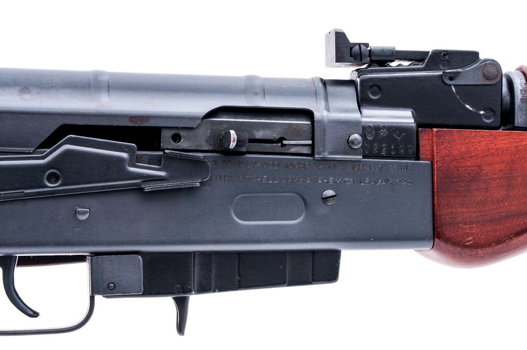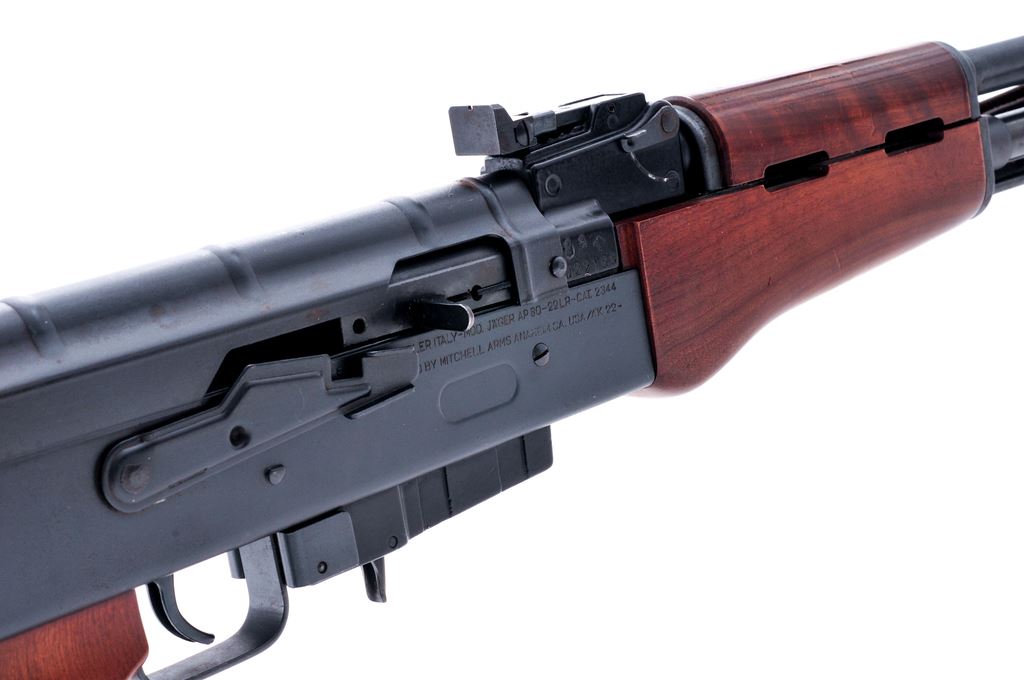 Adler Jager Model AP80 Semi-Automatic Rifle, #022199, .22 LR cal., 18'' barrel, blue/black finish, wood stock with vertical pistol grip, post front sight with added yellow paint, rear sight is adjustable to 100 meters, with brown leather sling. No magazine. Imported by Mitchell Arms and marked on right side of receiver. Condition is very good retaining approx. 98% factory finishes. Metal with some scattered fine patches of red oxidation, most noticeable on the receiver. Wood with moderate shallow dents and other handling marks, the highest concentration being to the top edge of the buttstock. Excellent action and bore. Est.: $200-$300. (Modern)