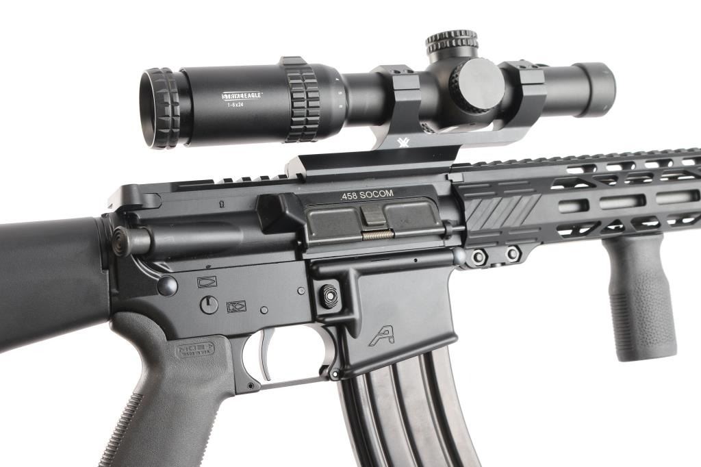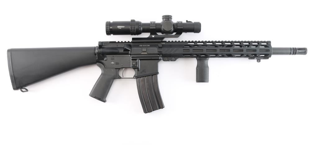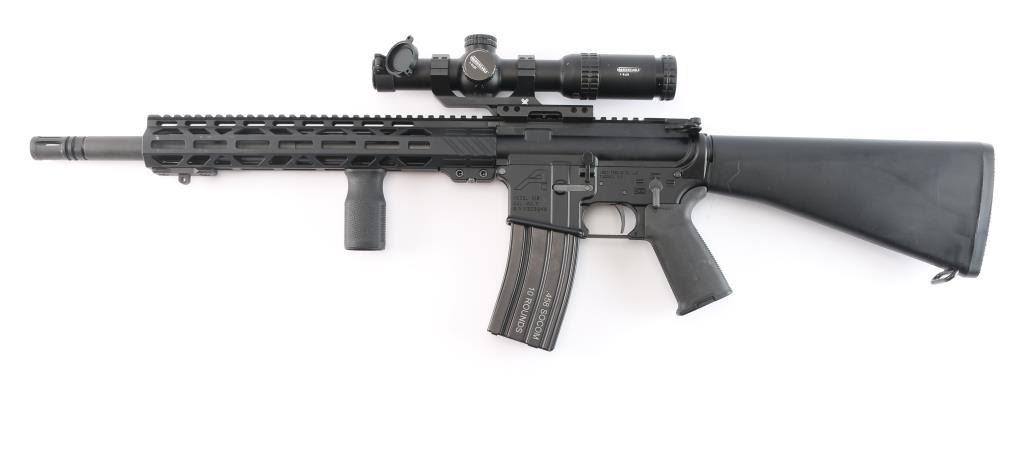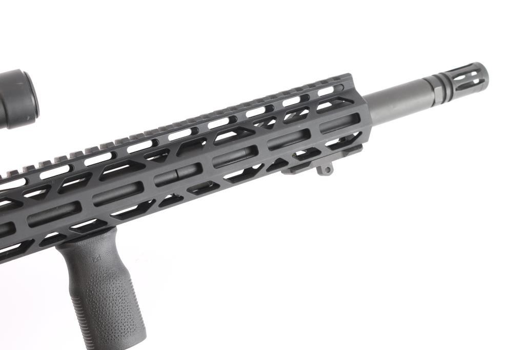 Semiautomatic AR15 style rifle with many premium components. Features Timney AR-15 Drop-In Solid Competition 3 lb Trigger, anodized black finish, 16" barrel, 4 flue flash hider. upper receiver with "keyhole" symbol (Cerro Forge) with Picatinny rail top, shell deflector, forward assist, 13" M-LOK anodized black handguard, with full length rail and MVG vertical grip, A2 style fixed stock, MOE+ hard rubber grip with storage compartment. Mounted with a Vortex StrikeEagle 1-6x24 scope, AR-BDC3 reticle, clear optics, Vortex base Overall excellent condition. Bore is pristine. one Palmetto State Armory 30-rd magazine.