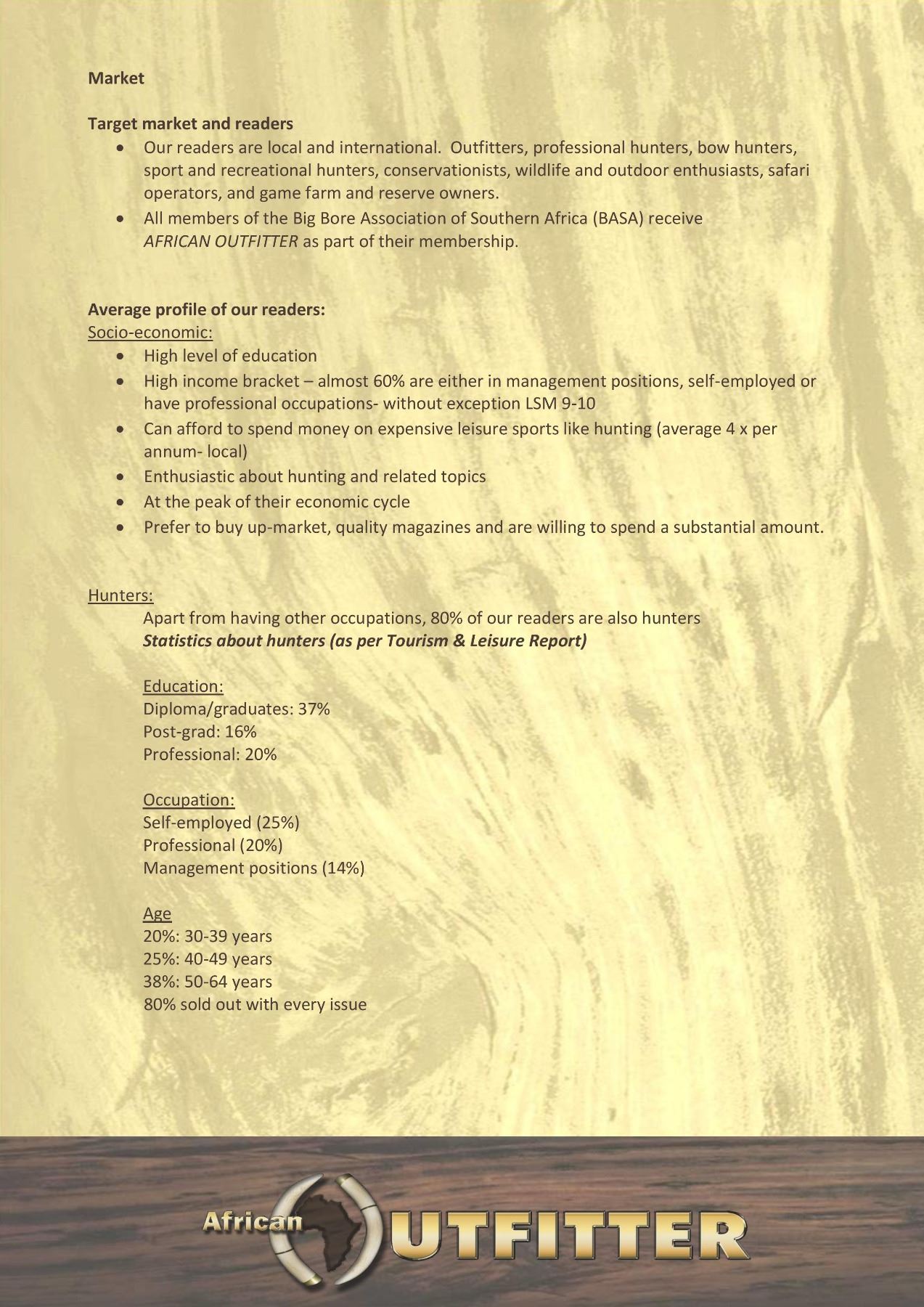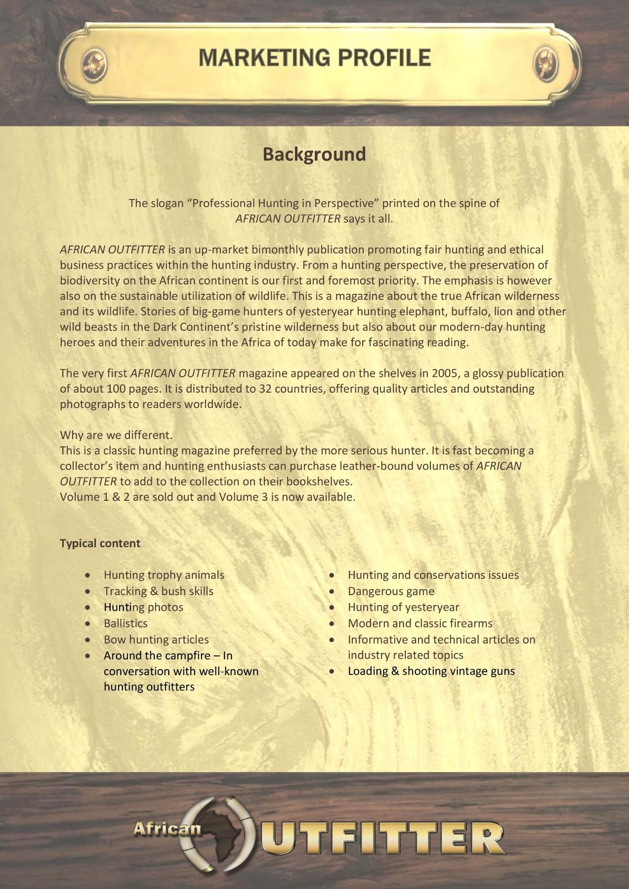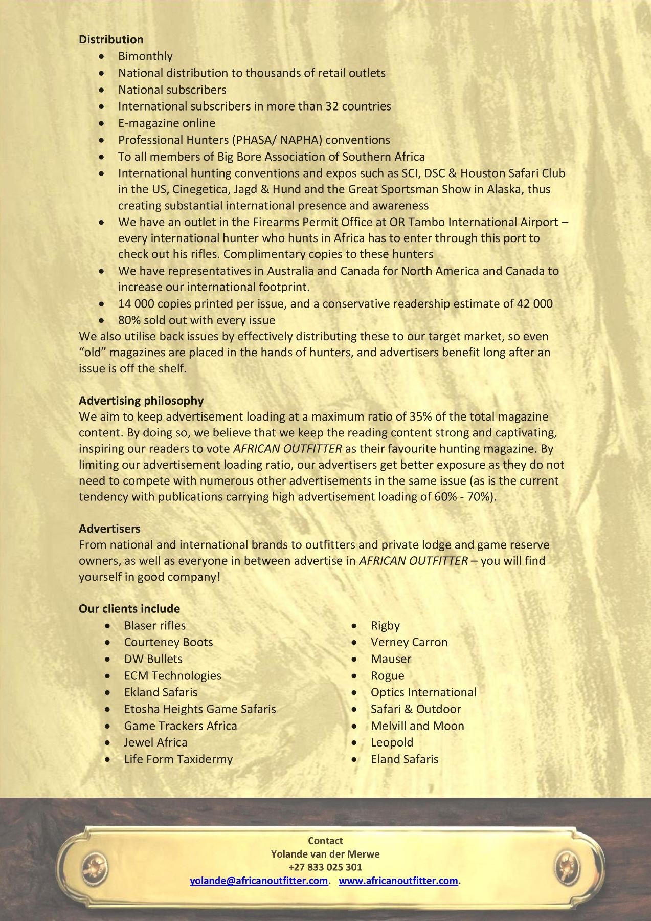 Full Page Ad in the Showcase Issue Jan/Feb 2020. AFRICAN OUTFITTER is an up-market bimonthly publication promoting fair hunting and ethical