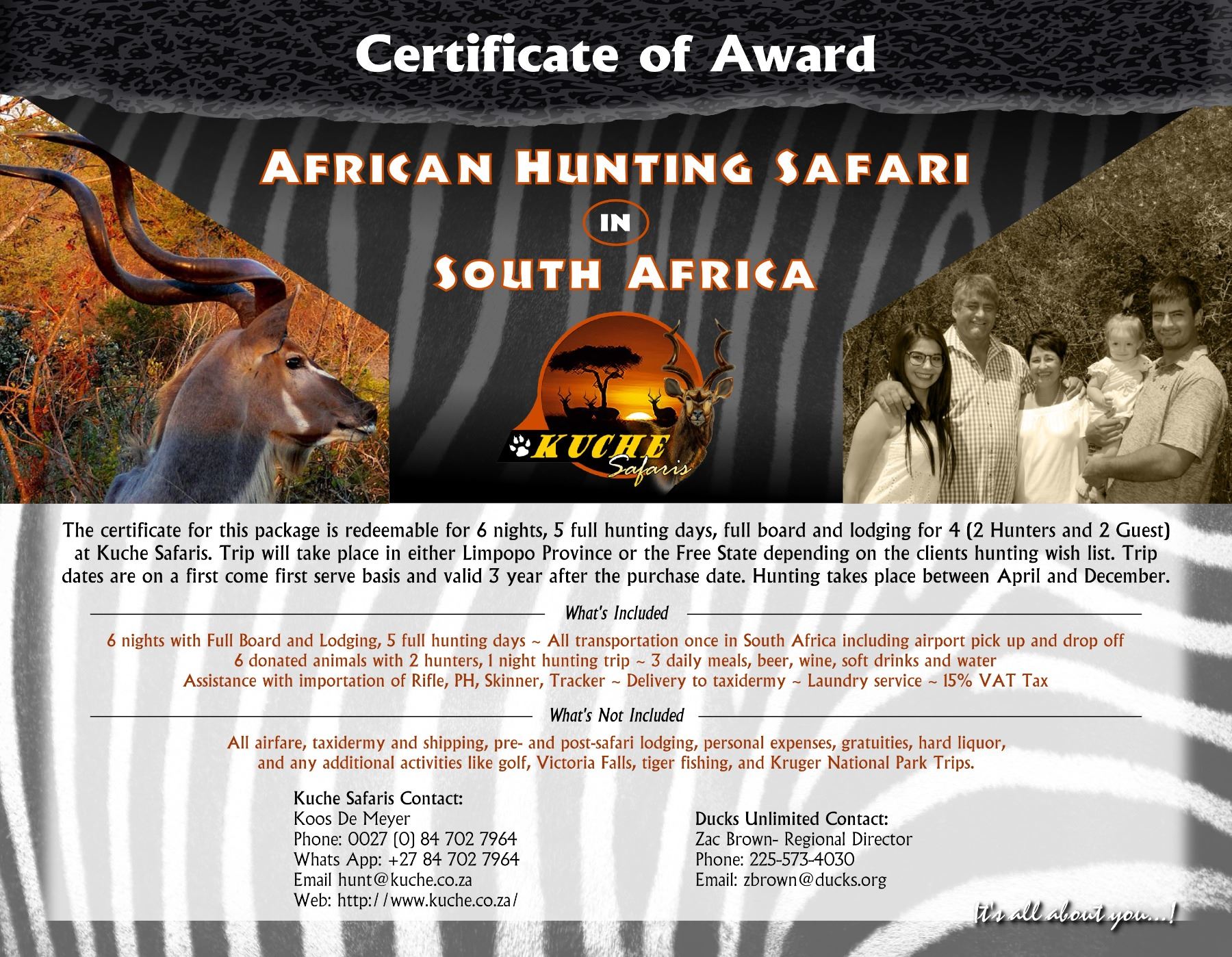6 nights, 5 Full hunting days, full board and lodging for two hunters and 2 guest. Kuche Safaris is proud to offer you this great opportunity to enjoy the game rich Limpopo Province of South Africa on a hunting experience of a lifetime. Package includes 6 donated animals (1 Bles Buck, 1 Blue Wildebeest, 2 Impala, 2 Warthog). All trophy fees are included, and animals are guaranteed to meet SCI minimums or hunter can harvest another. Buyer has up to 3 years from the purchase date to embark on the Safari.
