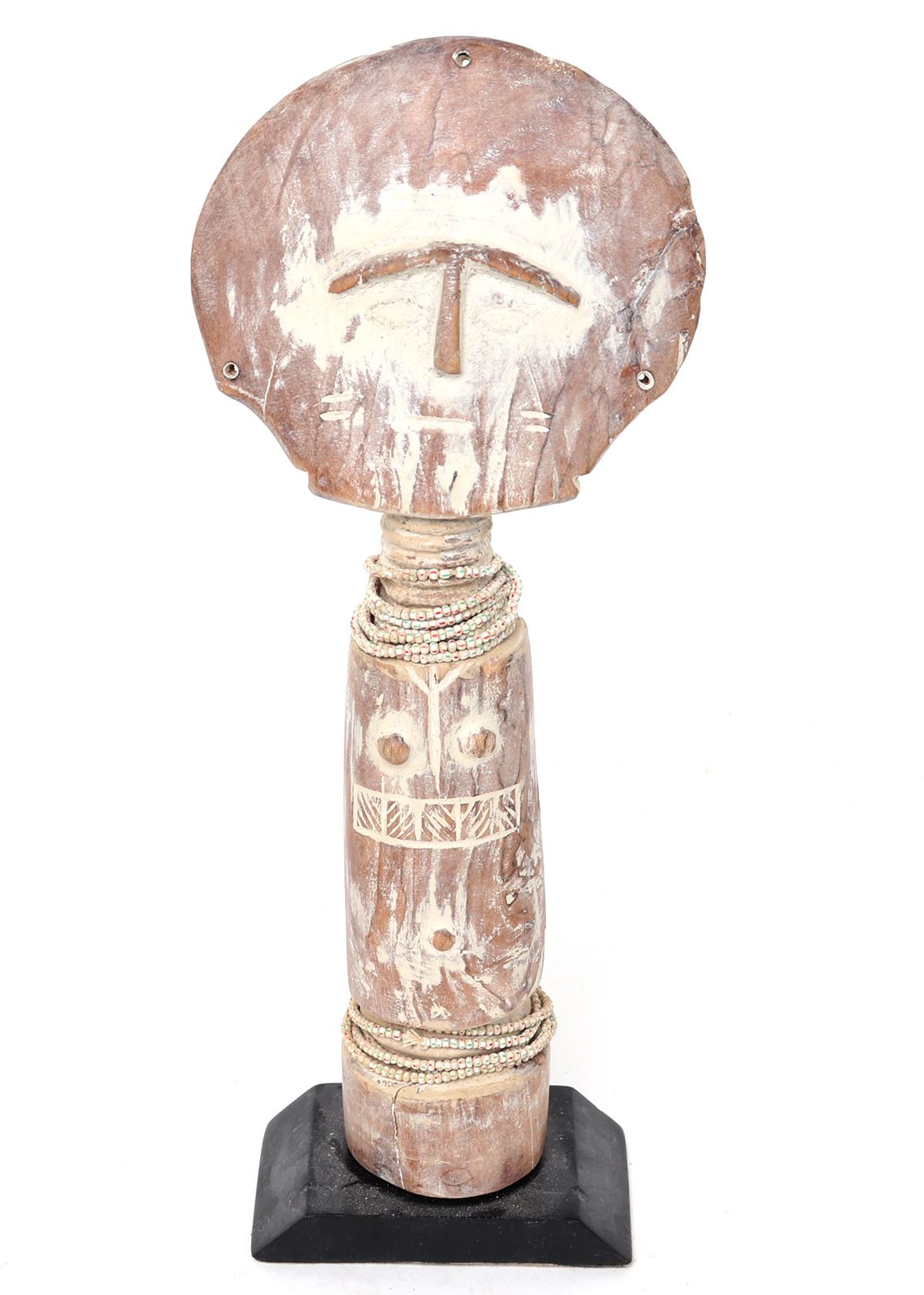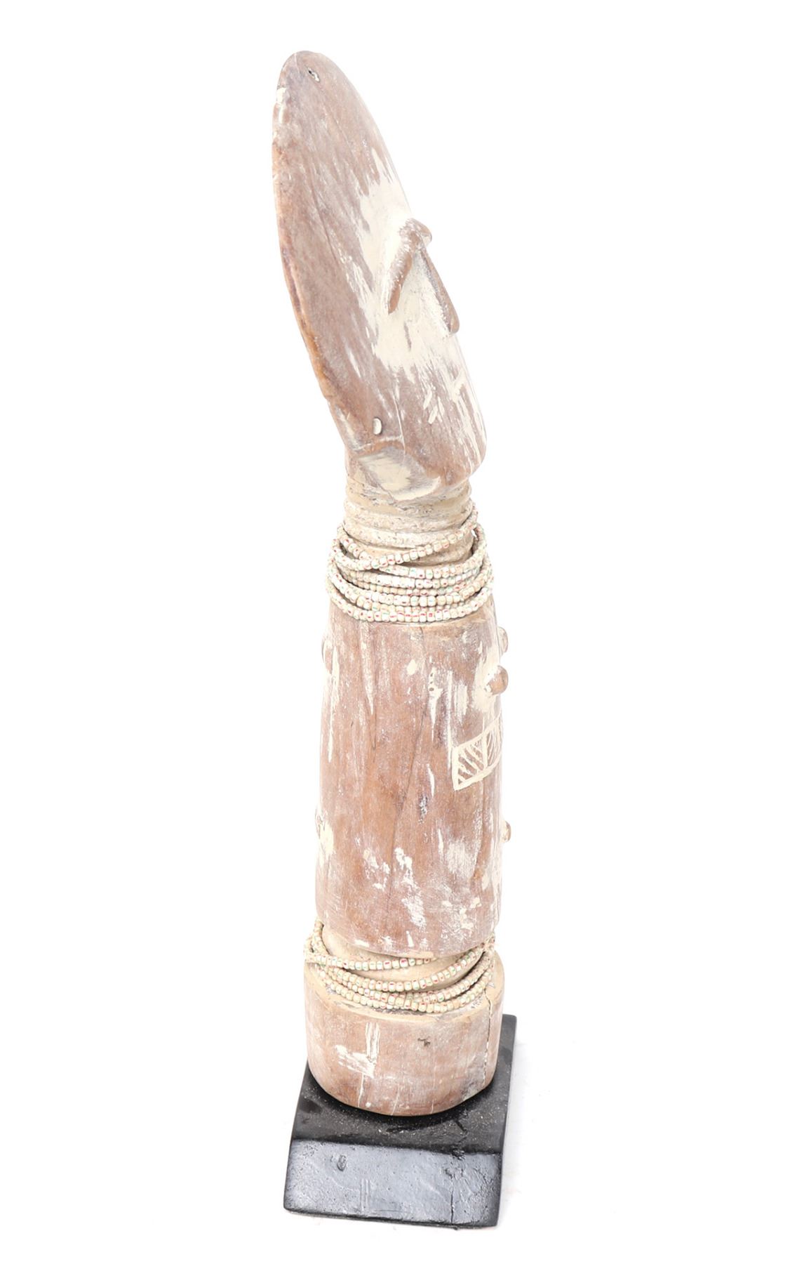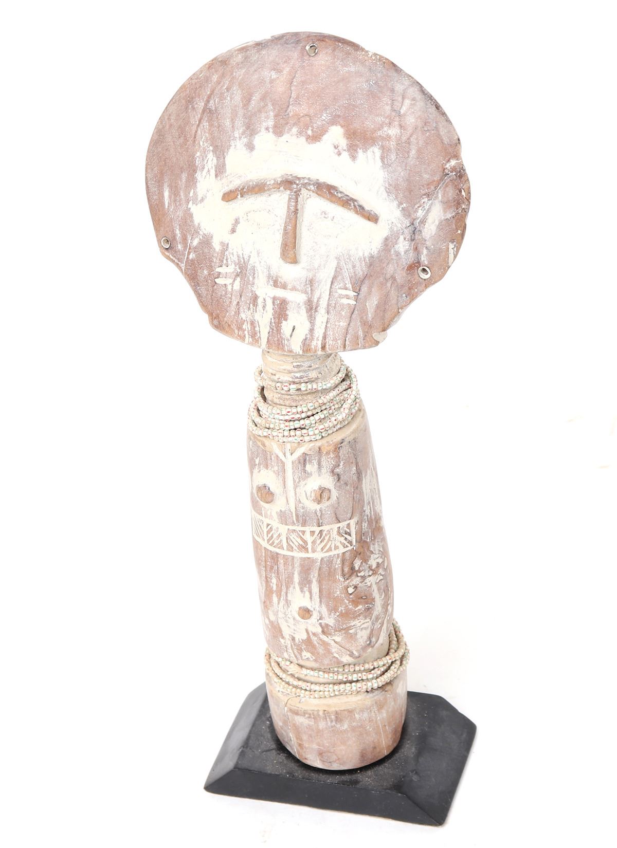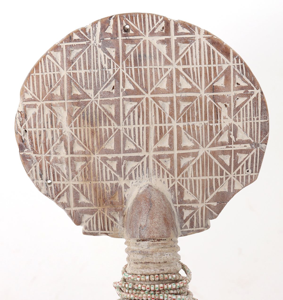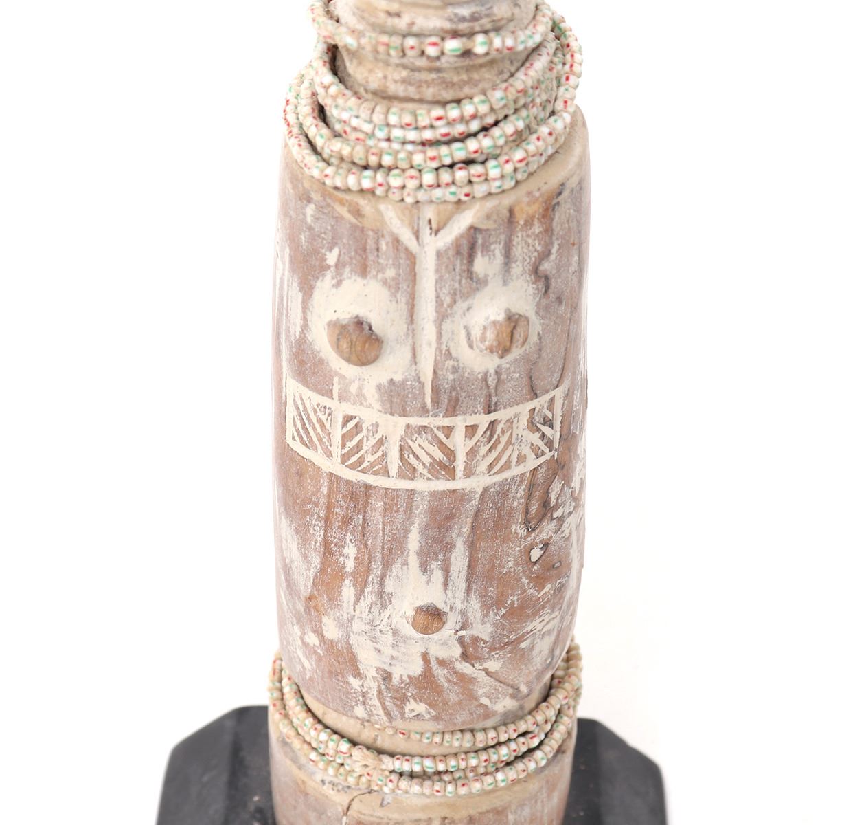 Finely carved African fertility doll. She stands with minimalistic features, arms and breasts incised rather than protruding. Classic moon shaped face with beautiful cross hatching incised to the reverse. Beautification scars to the arms and belly. Yellow, white and blue beads adorning her neck and waste. Size 12" H, 3 7/8" W. Condition: Good overall condition with minor surface wear and losses.. Provenance: Family collection of an esteemed diplomat and ambassador amassed during travel and work circa 1960-1990s in the medical field providing charitable advanced medical care throughout the African continent and internationally.