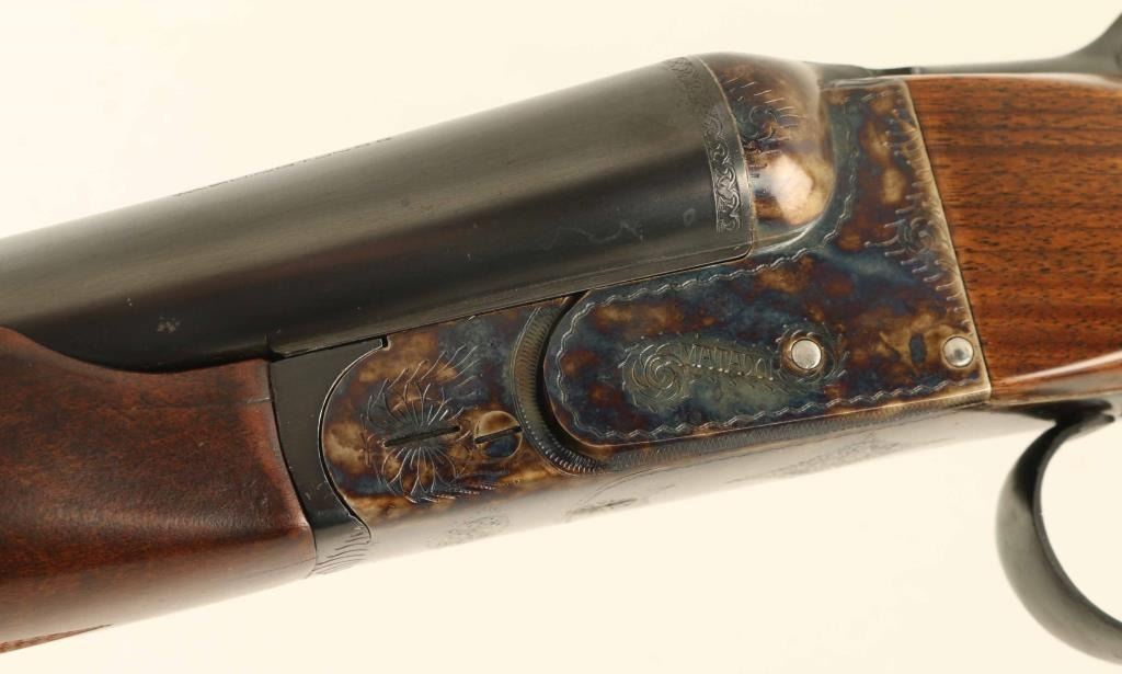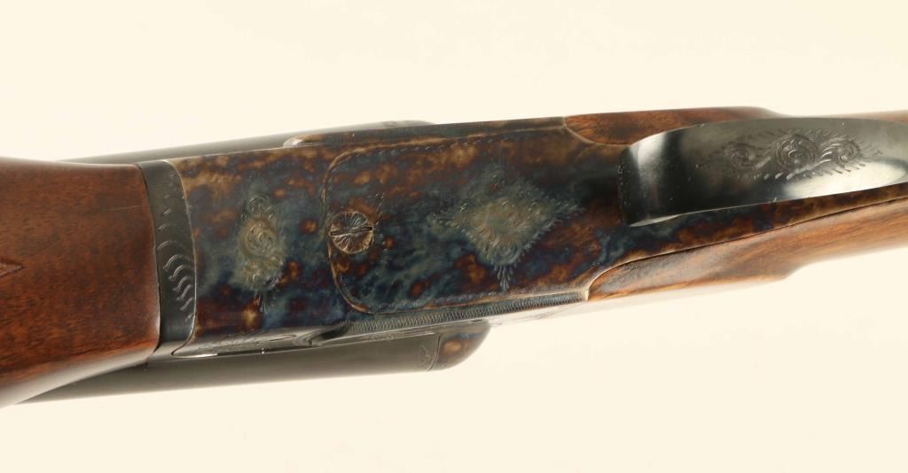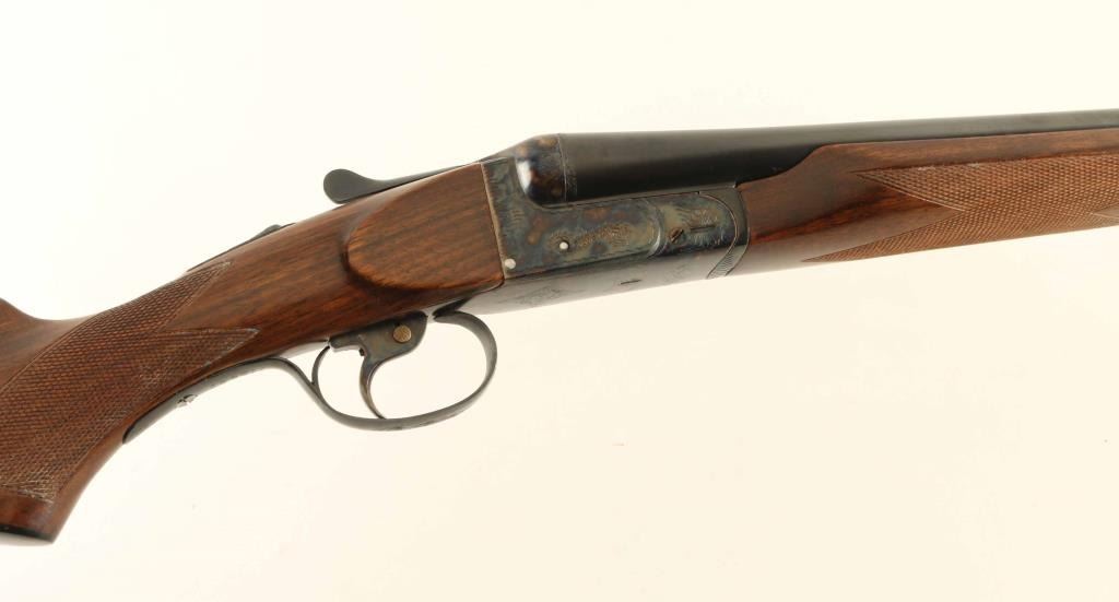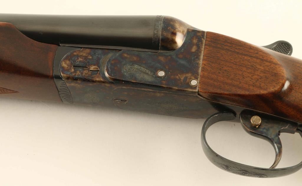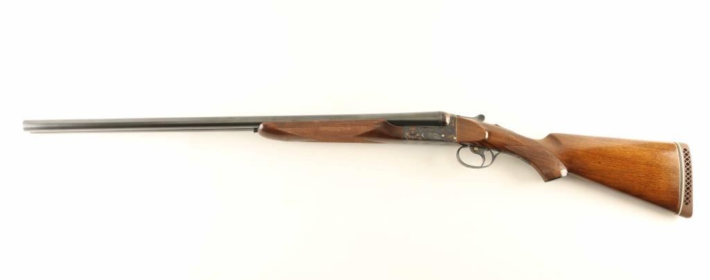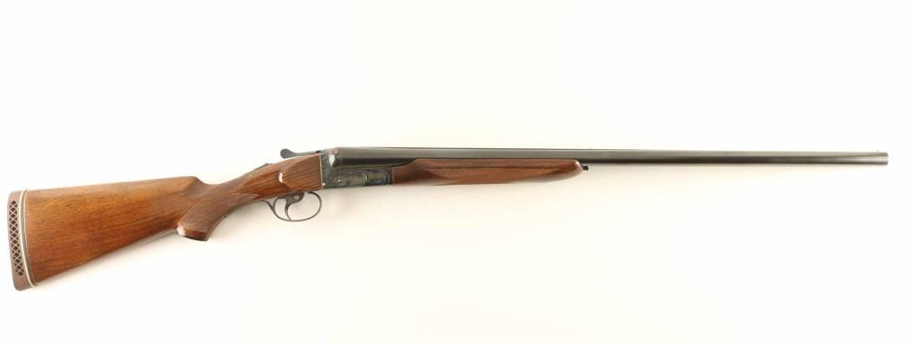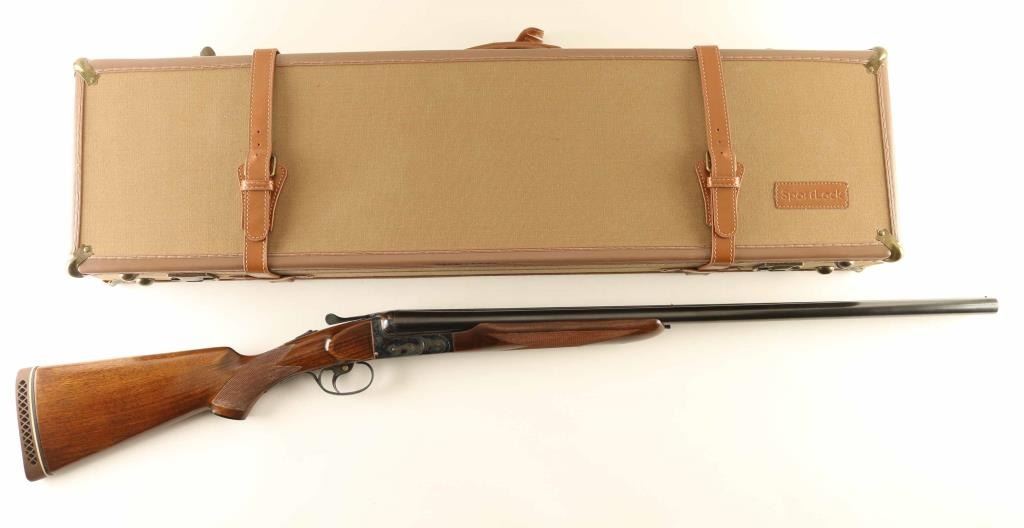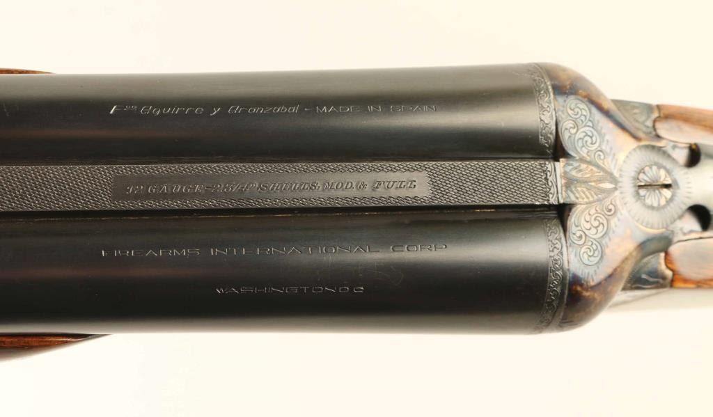 SxS double barrel shotgun made in Spain, imported by Firearms International Corp, Wash DC. Features blued finish, engraved case color receiver, 28" barrels with raised matted rib, accepts 2-3/4" shells, brass front & mid beads, single trigger with barrel selector button, tang safety, selective ejectors, wood beavertail forend with checkered panel across bottom, curved grip wood stock with checkered wrist, black composition grip cap, ventilated rubber recoil pad. Chokes have been bored out (previous owner states work done by Briley to SKT), measure IC with a bore gauge. Bores are very good. Overall condition is excellent with few signs of handling. Markings are crisp, observed numbers match. Approx stock dimensions: 14-1/2" Length of Pull, 1-1/2"" Drop at Comb, 2-3/8" Drop at Heel. Includes new condition "SportLock" luggage style case with tan cotton duck cover, faux antique hardware, leather closure straps. Condition is NRA Excellent - chokes rebored *** Modern Firearm ***