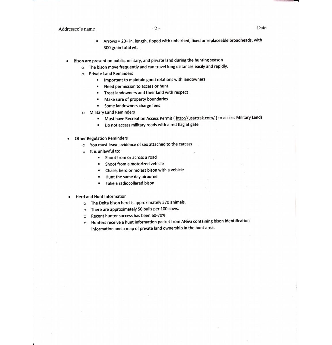 Here is an extremely rare chance to get your hand on an Alaskan Delta Bison tag. This tag will give you the opportunity to hunt this herd from October 1, 2013-March 31, 2014. Method of take is rifle, muzzleloader or bow. The Delta Bison herd is approximately 370 animals, with 56 bulls for every 100 cows. Recent hunters' success has been 60-70%. This tag will allow you to hunt the Delta Bison herd during the open dates until a Bison has been harvested. The Delta herd is present on public, private, and military land during the season. Permission must be obtained from landowners to hunt private land and must have a Recreation Access Permit to access military land. Hunter must complete a hunter orientation either online through the Alaska Department of Fish and Game website or in person at the Delta Area Office and the certificate of completion must be carried during the hunt. In-person orientation for the 2013-2014 season are Sept. 30, Oct. 4,11,17, Oct. 25, and Nov. 1. Weapons and ammunition restrictions apply; consult Alaska Department of Game and Fish for details. This is an auction for a tag only; no accommodations, meals, outfitting arrangements, licenses, &c. are included and all further costs are the responsibility of the buyer. More specific information regarding the hunt can be obtained from the Alaskan Department of Fish and Game, Darren Bruning in Delta Junction office at (907) 895-4484 or Darren.Bruning@alaska.gov.
