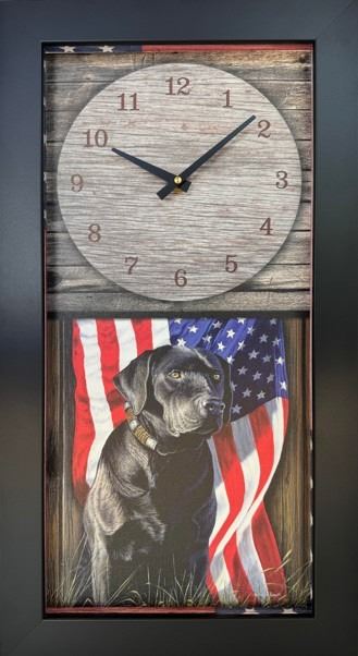 Showcasing the striking artwork of Anthony Padgett, this wall clock blends creativity and patriotism in a functional statement piece. The image is printed on high-quality canvas and framed in hardwood with custom American flag liners, adding both depth and character. Reliable quartz movement ensures accurate timekeeping, while included hardware makes hanging simple. Measuring 12” x 22.5” x 2” and proudly made in the USA, this clock is designed to stand out in any space.