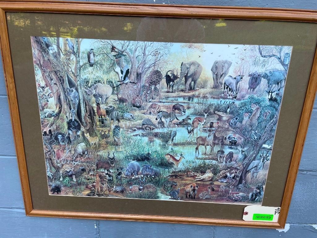 Beautiful Art Print of Africa's Animals. It is entitled "All Creatures" and is signed by the artist "Charlotte FK 1992". The Glass and Wood Frame measures 35" Long x 27" Wide. To Learn more about the artist click the link below: