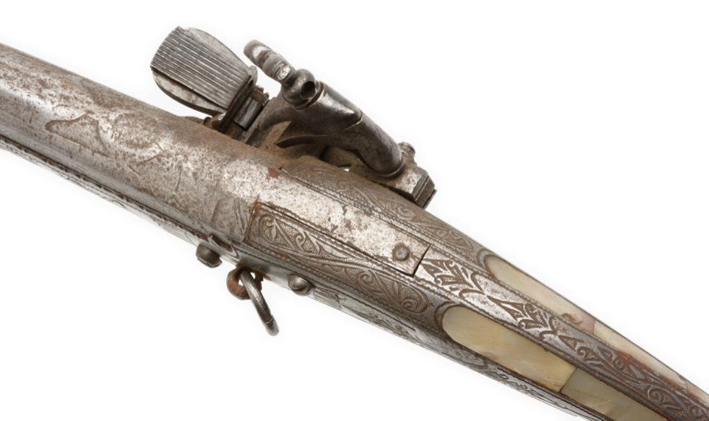 All metal Miquelet flintlock carbine with pearl plaque inlay in butt stock; great form; probably Greek or Albanian; .65 smoothbore caliber, 42.5” overall. Est.: $900-$1,800.