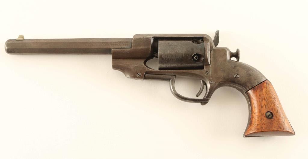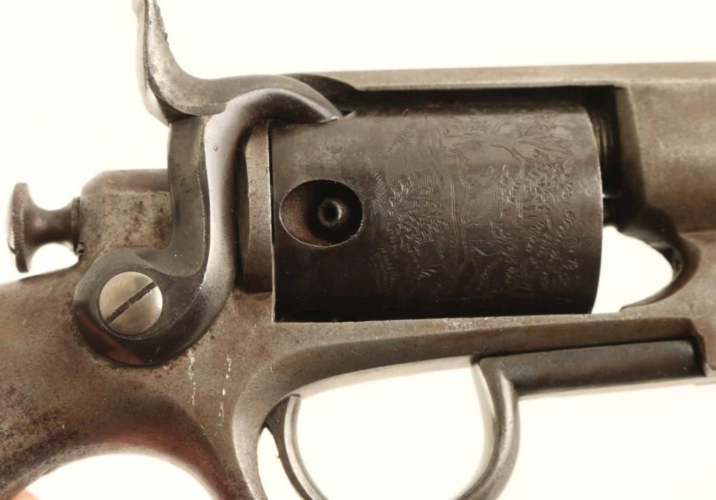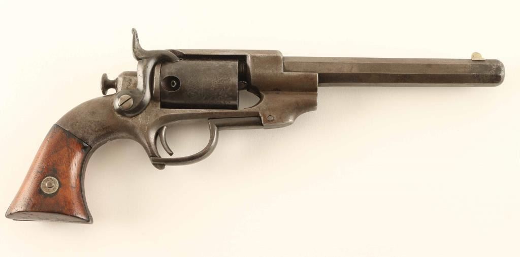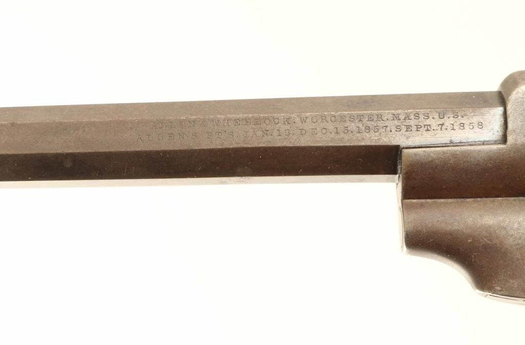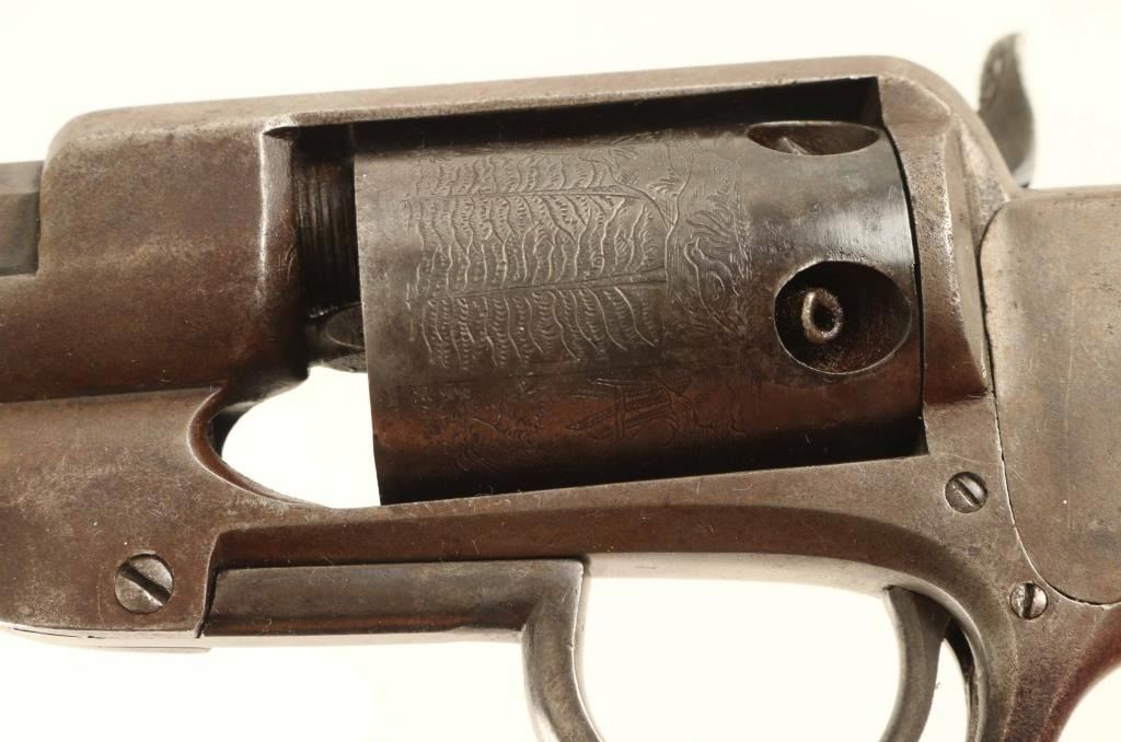 Allen & Wheelock Percussion Revolver in .31 caliber with a 5 ¾” octagon barrel, S/N 744. The last patent date is “Feb 7, 1858”. Good to very good overall condition with traces of blue going to brown patina with some light rust and minor pitting. Good address and full original rolled cylinder scene of game in forest. The grips and action are good. 1 of approximately 1000 made in .31 caliber. Condition is NRA Good + ****Antique Firearm****