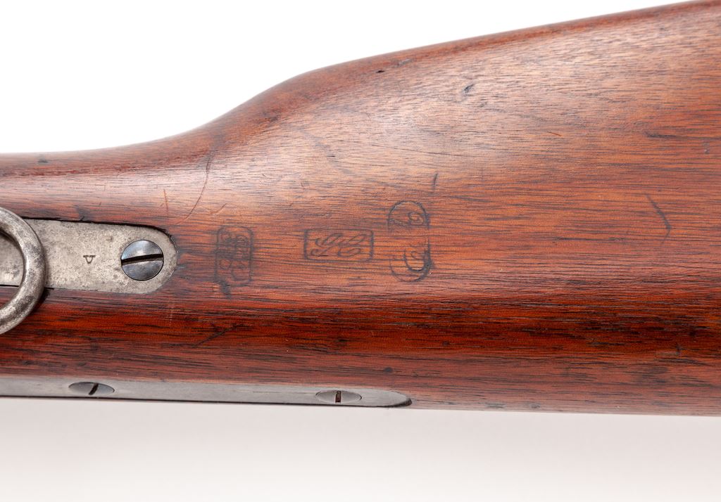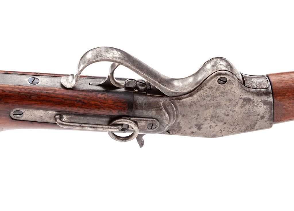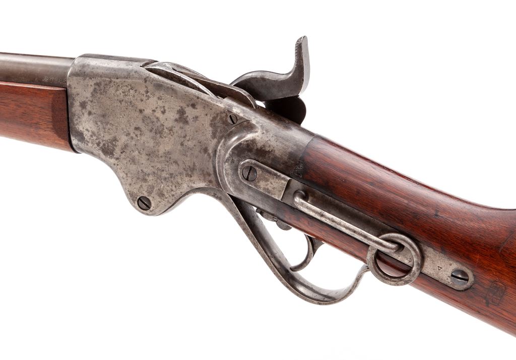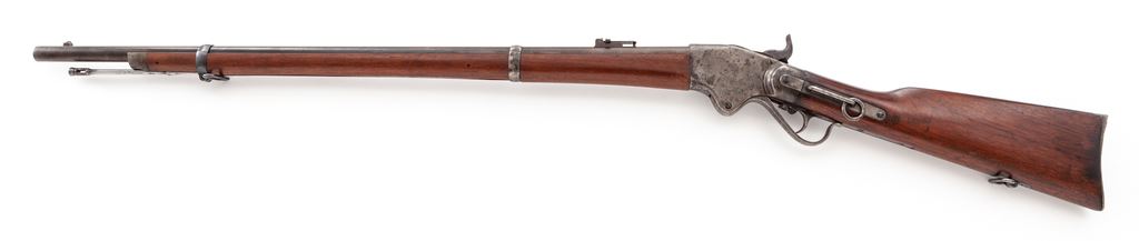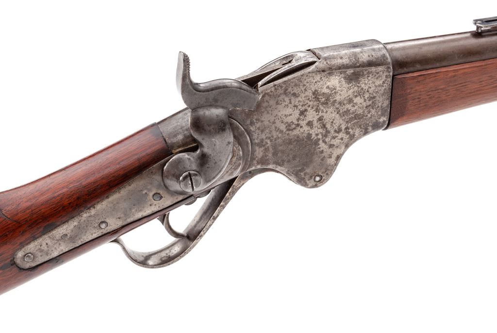 Spencer Cavalry Carbine Altered to Two-Band Cartridge Infantry Rifle, #27646, .50 RF cal., 32.5'' round barrel, post-Civil War converted at Springfield Armory to fire metallic cartridges with the addition of a new three-groove barrel and a Stabler cut-off device, in a quantity of only 1,108 guns. ''Model 1865'' and 4-line patent dates and ''Manuf'd at Prov. R.I. by Burnside Rifle Co.'' atop receiver at breech. Retains a Civil War-era Carbine sling bar and ring at left wrist. Originally finished in blue and case hardened metal. Oil-finished walnut stocks having three mostly legible inspectors' cartouches behind wrist, steel crescent buttplate with trapdoor and internal cartridge tube that slides out for loading. Condition is very fine having a smooth brown patina mixed with some original barrel blue; case hardening mostly silvered out. Wood is smooth having sharp edges and showing only minor use and age, quite remarkable for a military rifle. Action is tight and crisp. Bore appears bright. A scarce Spencer. Est.: $2,500-$3,500. (Antique) (Joe Poyer collection)
