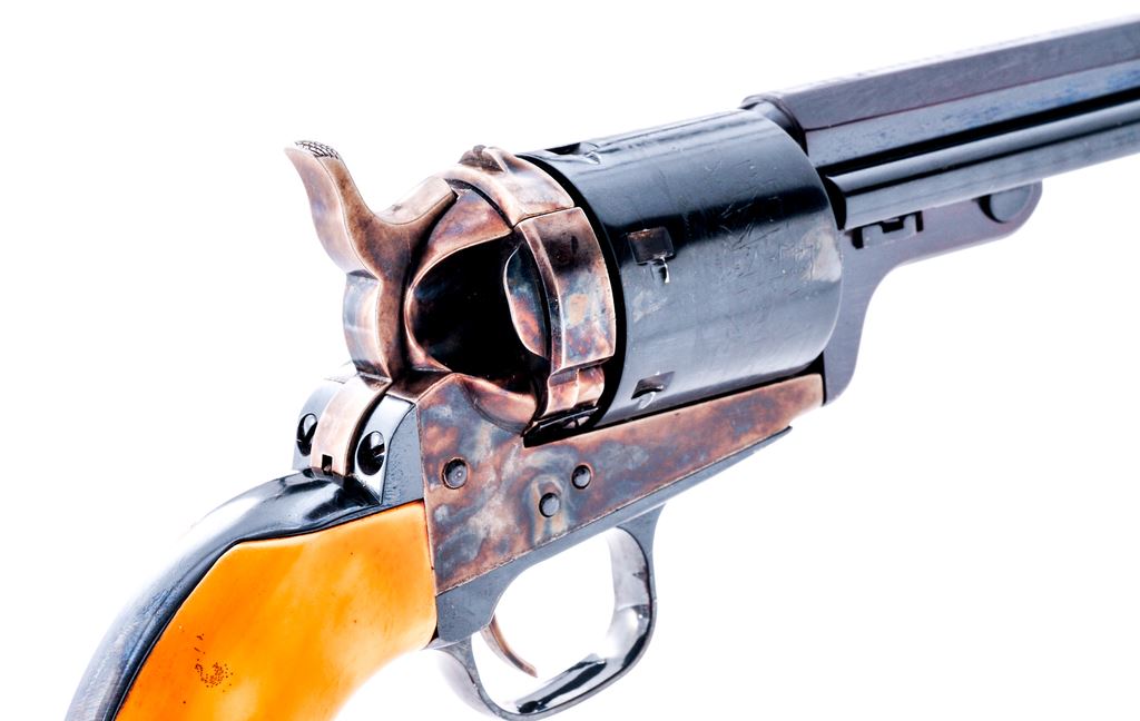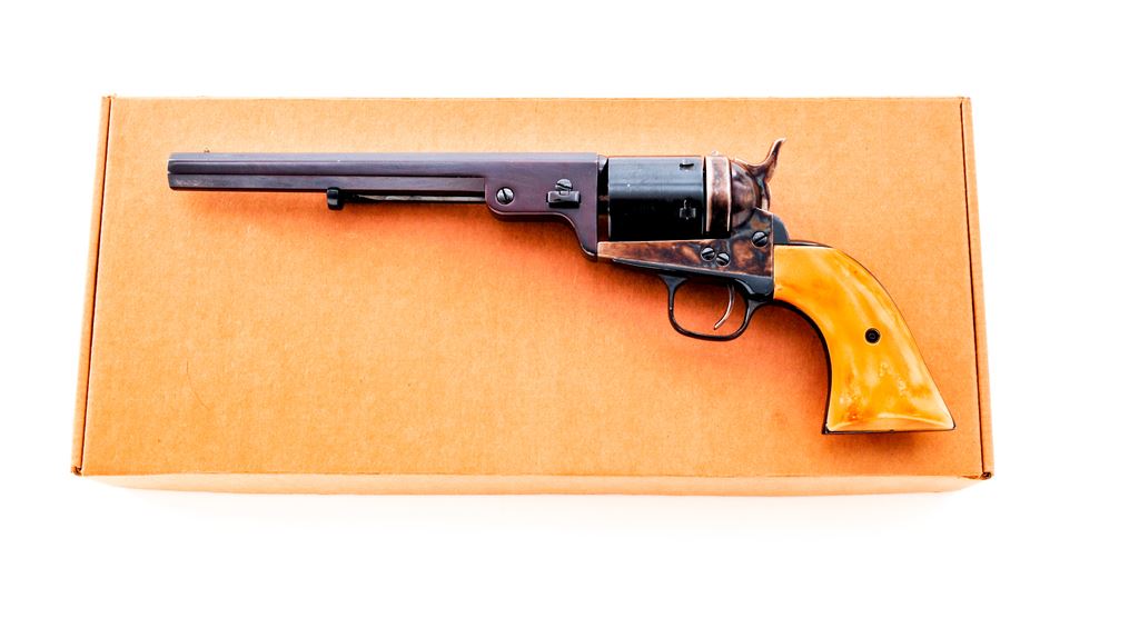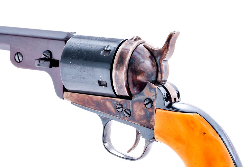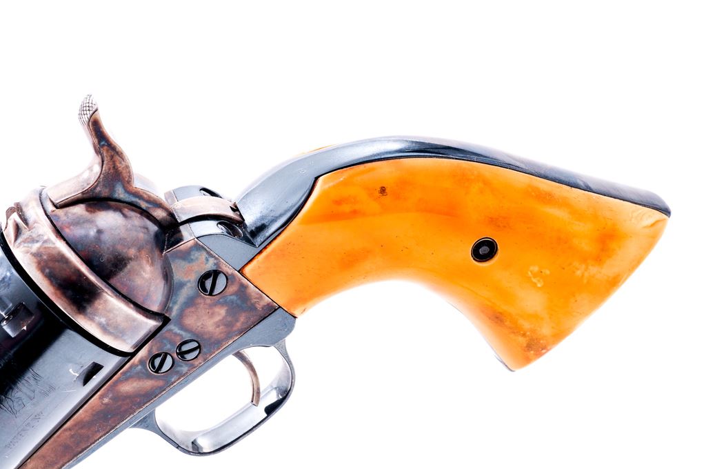 American Frontier Firearms Reproduction of an 1851 Richards-Mason Conversion, #JB3, .44 Russian cal., 7.5'' barrel, blue and case hardened finish, faux ivory grips, with brass bead front sight. Included is a plain cardboard box with firearm information written on the end. Metal surfaces rate fine and retain approx. 97% blue and case colors. Barrel is plum colored appearing to have been reblued over surface scratches and minor nicks. Triggerguard and backstrap with a polished blue finish. Grips with an antique distressed look. Action and bore are both excellent. Est.: $300-$500. (Modern/PPT)