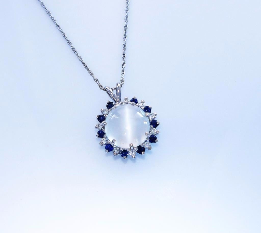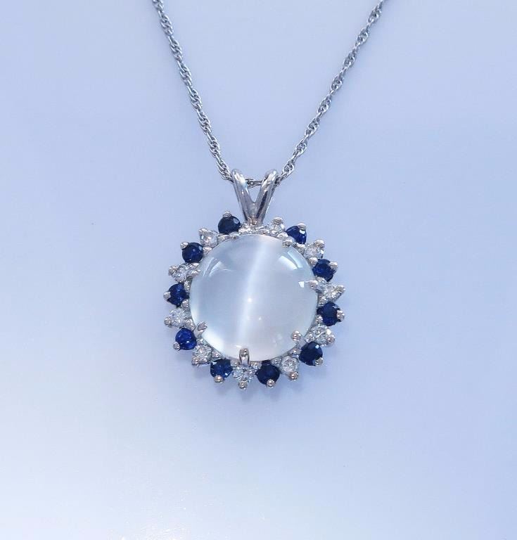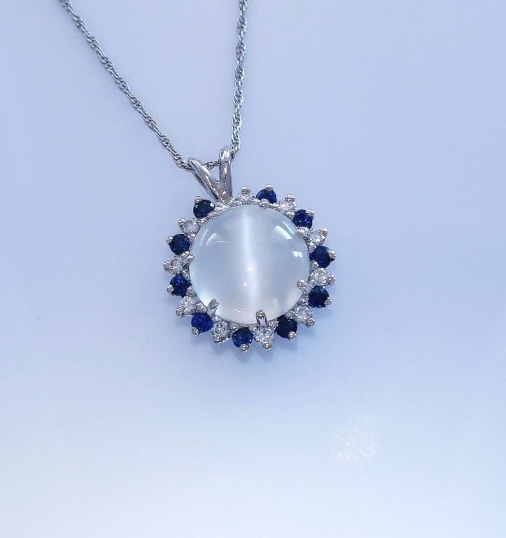 weighing approx. 5.00 carats encircled by 20 round fine diamonds and sapphires weighing approx. 1.00 carat set in a 14 karat white gold custom made setting. Retail $2,000-$3,000 Estimates $1,200-$1,800