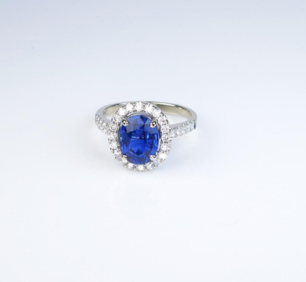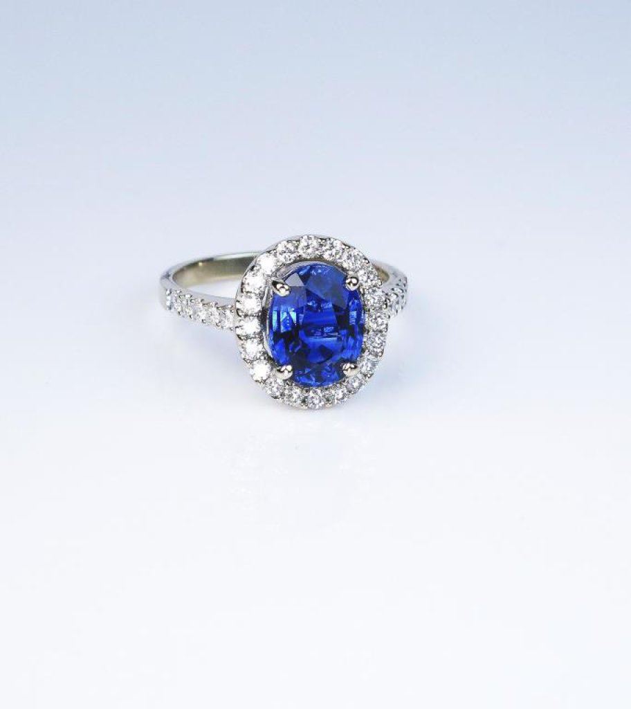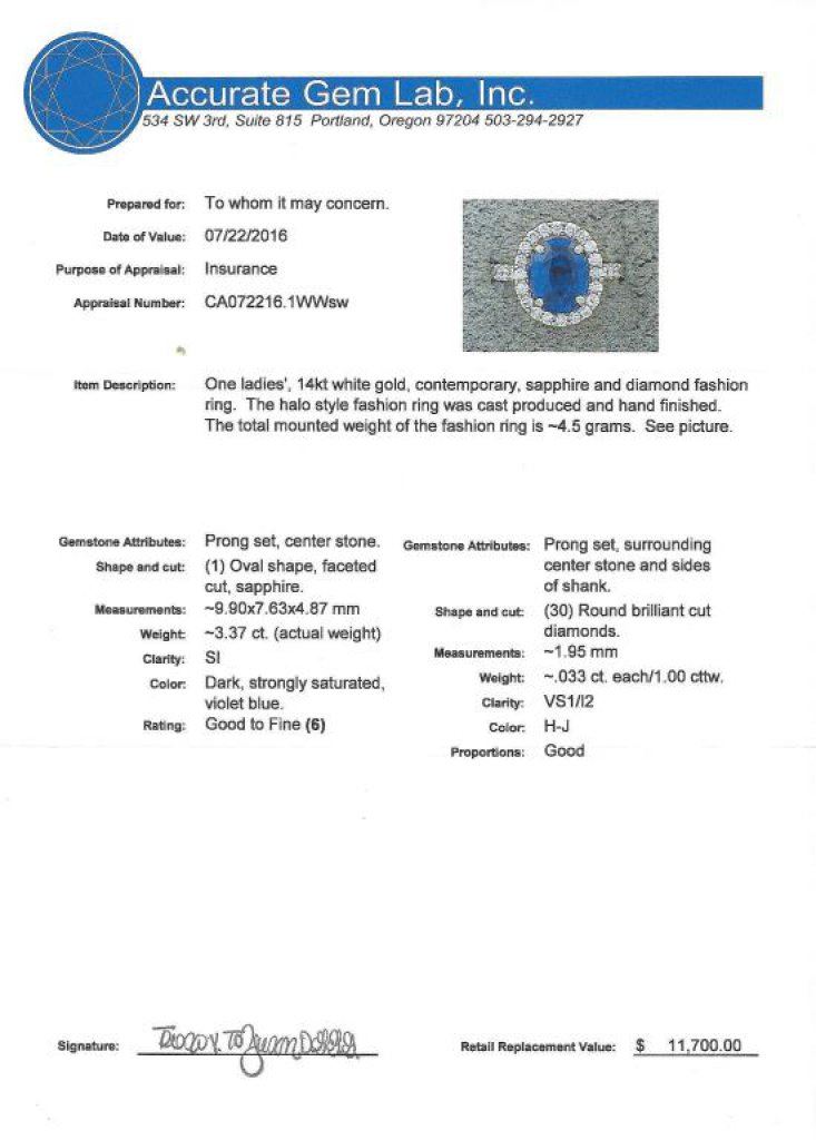 Sapphire weighing 3.37 carats and micro set with 30 round diamonds weighing approx. 1.00 carat of G-H colors and VS/SI clarity set in a 14 karat white gold custom made halo setting. Please see full Appraisal. Retail $12,000-$15,000 Estimates $6,000-$7,000.