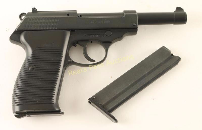 American made 4/5th scale P38 clone chambered in 22 Long Rifle, designed by Erma-Werke. Features a matte black finish, 5" barrel, blade front sight, drift adjustable rear sight, thumb safety, serrated round hammer spur, smooth trigger, 10 round magazine and two piece grooved black plastic grips. Includes a MCM Case-Gard 808 pistol case and an extra magazine. Pistol exhibits 98%+ of it's original finish showing very minor wear and some slight imperfections under the finish on the barrel. Action is smooth, bore is excellent and grips are fine. Condition is excellent in case. ***Modern Firearm***