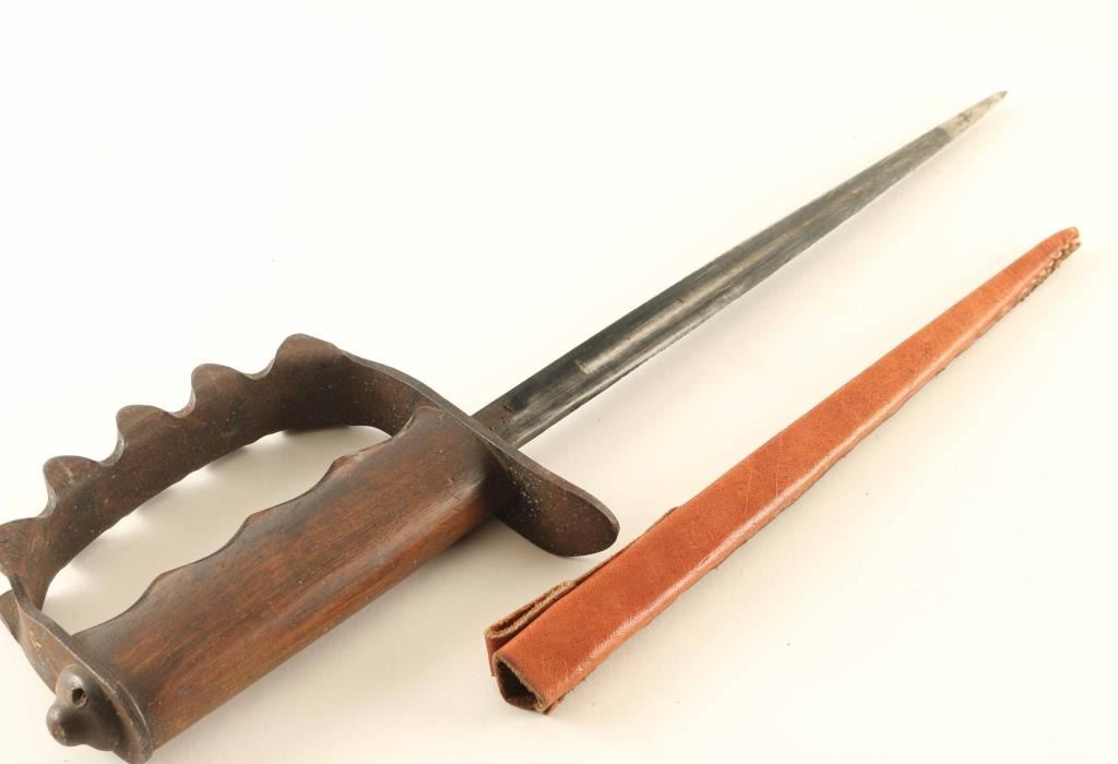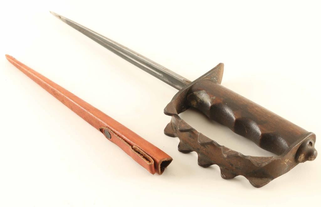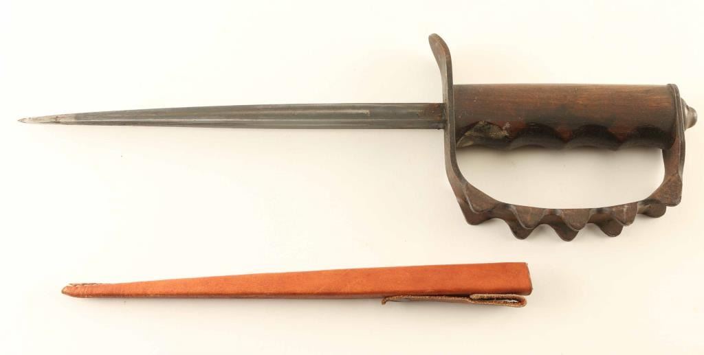 9" triangular stiletto blade. Wooden handle. 5 rounded protrusions on each side of the knuckle bow, AC. CO. U.S.A. 1917 marked on the inside. Knife has small flecks of white paint on it, should clean up nice. Nice condition, but needs some TLC. Comes in a incorrect brown leather scabbard.