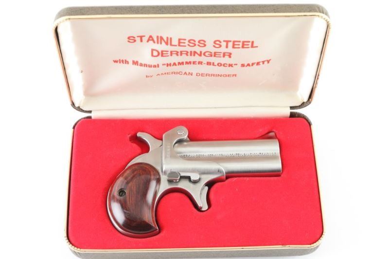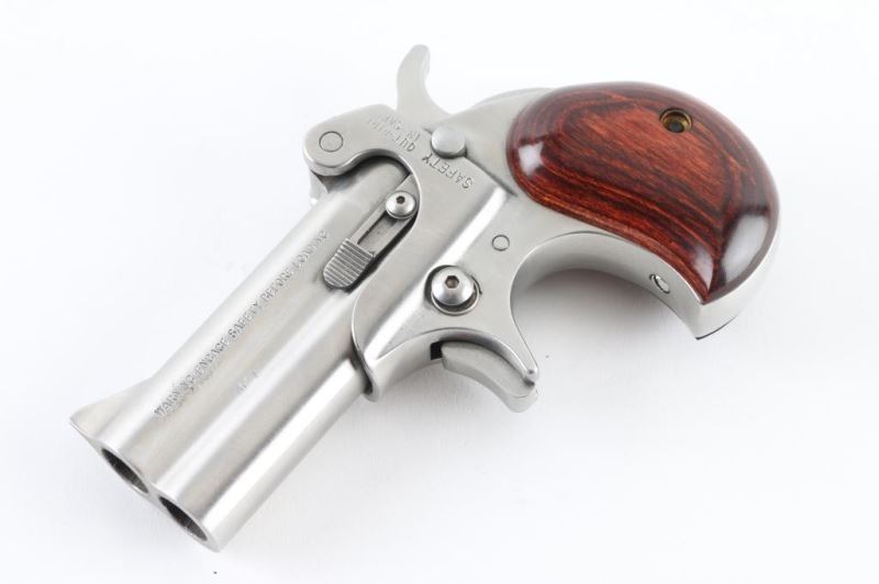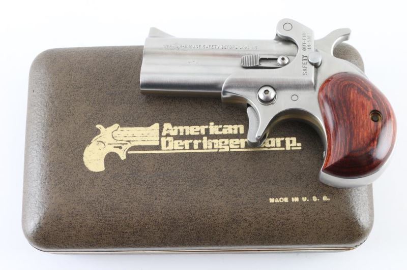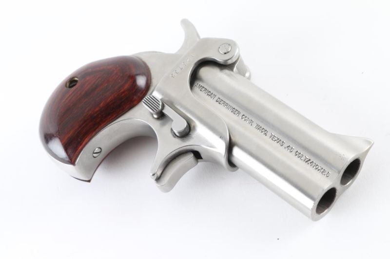 Sn: 123783 Over-under style derringer chambered for 45 Colt or 2.5" .410 shotshells. Features stainless construction, wood grips, manual safety, approx 3" barrel, exposed hammer. Bores are excellent. Overall excellent condition. Includes factory clamshell style storage box. NRA Excellent Modern Firearm