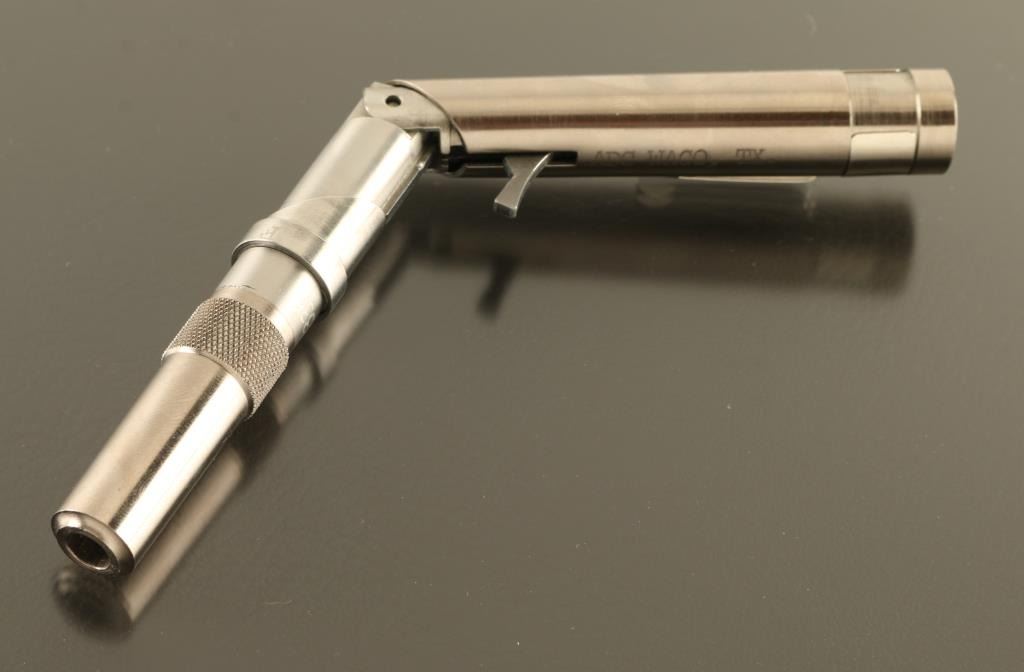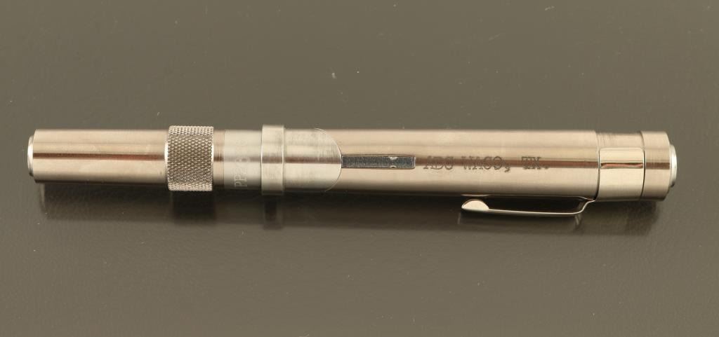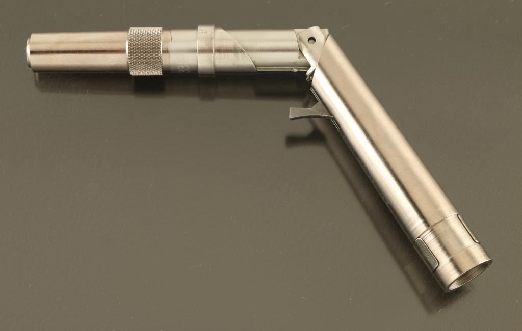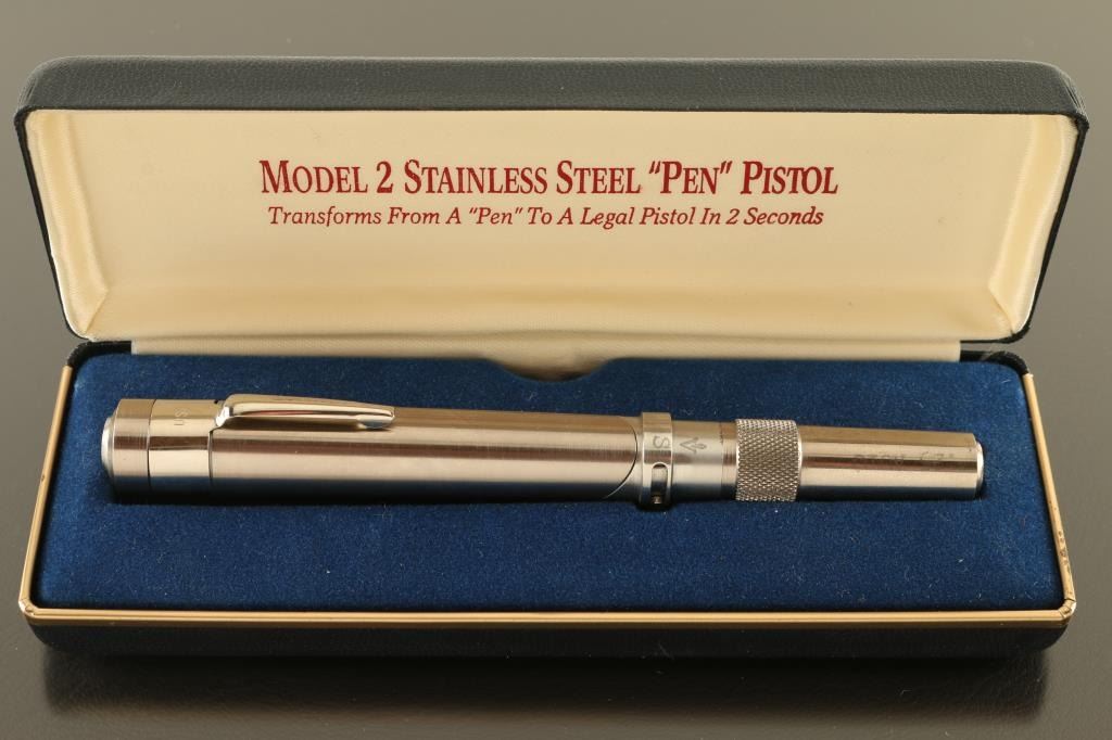 .25 Acp SN: PP2336 Single shot derringer folds into a pistol shape to fire, can be un-folded and stored in the shape of a pen. Features all stainless construction, 2" barrel unscrews to load/unload, no sights, manual safety, hinged trigger deploys when gun is folded into "gun" mode. Excellent condition overall. Includes factory presentation type case, manual. Condition is NRA Excellent *** Modern Firearm ***