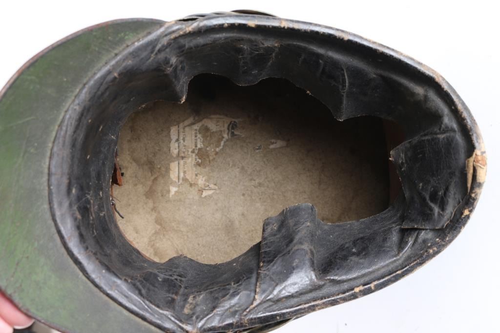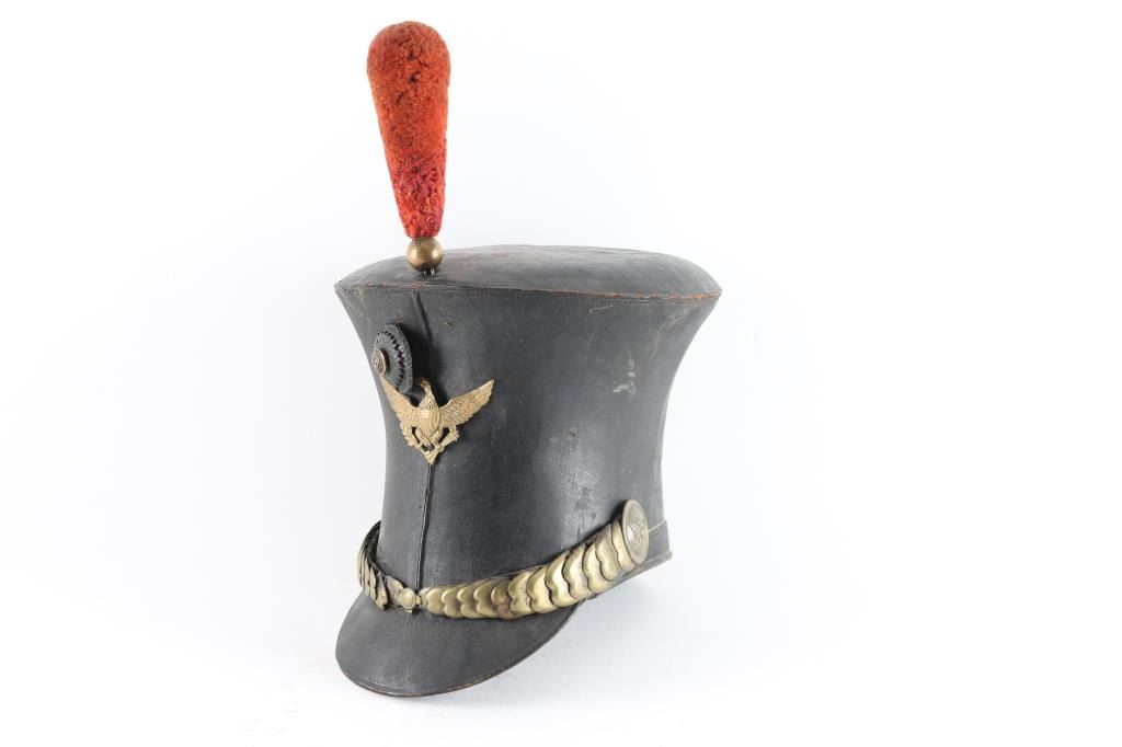 Circa 1830. Completely untouched, measuring 9-3/4" from the front of the visor to the front edge of the crown .Brass American Eagle plate. Red Pom-pom. Scaled brass chinstrap with leather backing and plain buckle. Brass American Eagle side buttons. Silvered eagle front plate of exceptional quality. Multi layered 1-7/8" leather cockade with one-piece eagle/Anchor button. Marine Corps ?(Loose) Thick leather visor. Interior retains the original 3" soft leather sweatband & remnants of makers label where you can make out Portsmouth N.H.. A really choice example of this iconic piece of American military headgear, as worn from 1821 through the Mexican War. From the Joseph Musso Collection