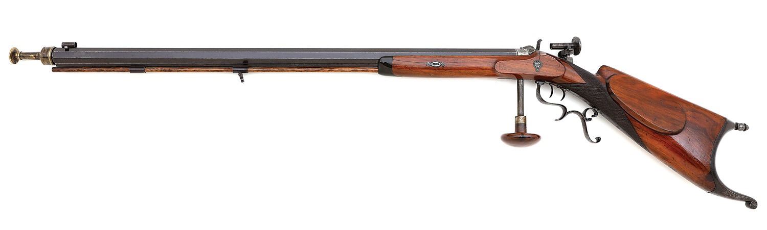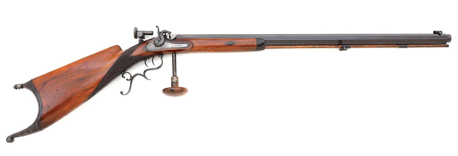 .40 cal, 33'' octagon barrel turned for starter with a bright excellent bore. The barrel retains perhaps 85% original plum-brown finish with areas toning to a deep gray patina under bright light, mild edge wear and some old oxidation speckling. The top flat is inlaid in silver with the maker's information ''H. BERG DAVENPORT IOWA.'' The breech plug with swirling bolster and tang have mostly toned to a silvery case-hardened patina while the lockplate retains some generous wisps of vibrant case-hardened colors and shows some light foliate scrollwork embellishments. The lockplate is nicely formed, following the contours of the raised stock flat, and the hammer is a nice plum-brown with attractive dolphin head. The fancy spur triggerguard shows some streaks of original bright blue in the protected areas mostly toning to gray-brown patina and the trademark Berg heavy schuetzen buttplate with acorn-like finial is a similar patina. The checkered walnut stock remains in very fine condition retaining about 92% original varnish showing a thin 5'' crack through the barrel wedge escutcheon on the left side along with some scattered light dings. The checkering with neatly mullered borders remains in very fine condition and the stock features nice left-side cheekpiece and horn tip. The rifle is sighted with a short tube aperture disc tang sight and target globe front with fine bead-on-post. A simple hickory ramrod is present along with a later nicely-made palm rest and starter. The lock with double set triggers seems to function well mechanically. Henry Berg was a very respected schuetzen rifle maker and prominent schuetzenverein member in Davenport. This elegant rifle is pictured and described on pages 204 & 205 of ''The American Percussion Schuetzen Rifle'' by Hamilton & Rowe. (13C11108-81) {ANTIQUE} [Tom Devers Collection] (2500/3500)